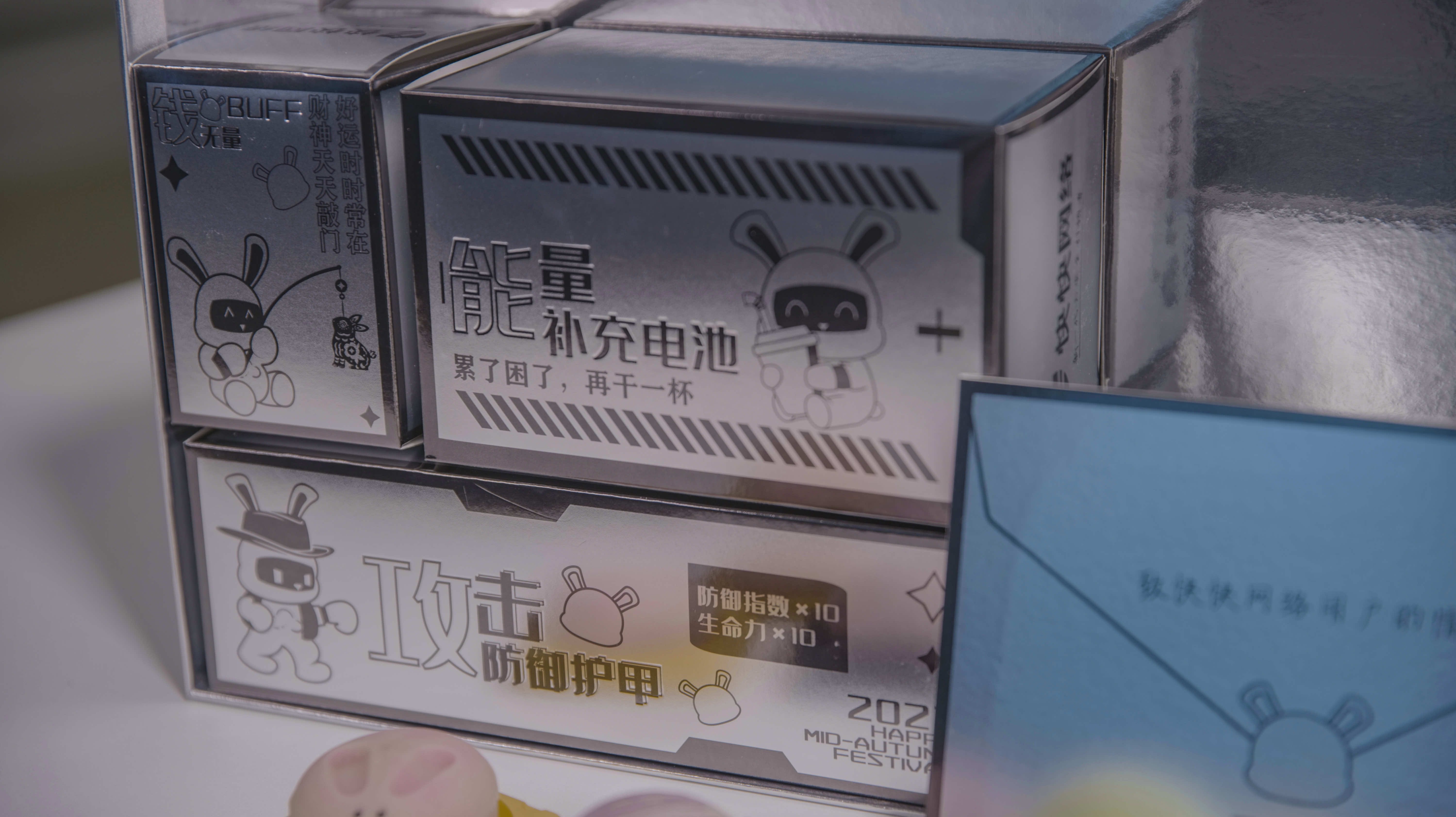 快快网络的中秋礼盒以游戏为主题,以常见的游戏奖励为概念,用充满未来感的冷硬金属色作为包装风格,印上不同造型的IP形象“快快兔”。