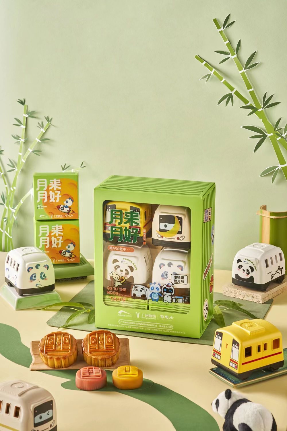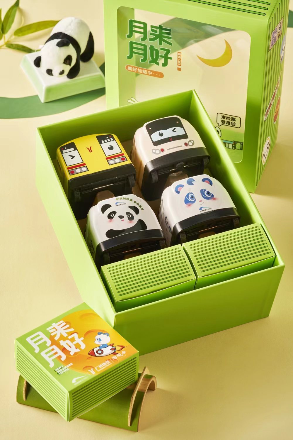 这款《月来月好》中秋文创礼盒里,装月饼的盒子是熊猫车仔和一、二号线车仔。外观是竹子配色的,也太可爱了吧