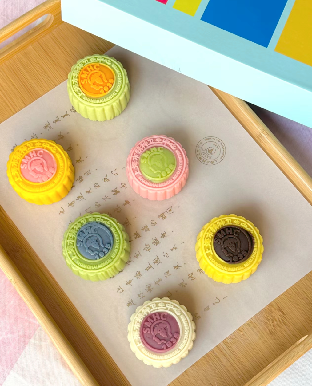 这一次,月饼采用多巴胺配色,特别吸睛。面上依然印有“上海市精神卫生中心”,英文缩写“SMHC”,还有初建的年份“1935”。月饼中间是院徽图案。