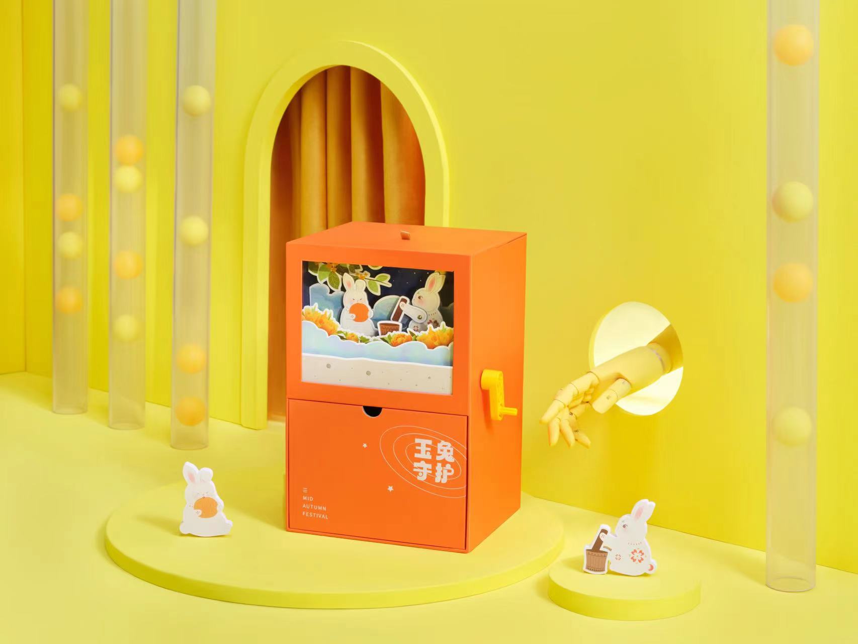 礼盒上方是立体可爱玉兔捣药插画。摇动侧面的手柄,插画中玉兔开启捣药工作模式。礼盒内部空间超大,在节日过后也能作为桌面收纳,循环利用。