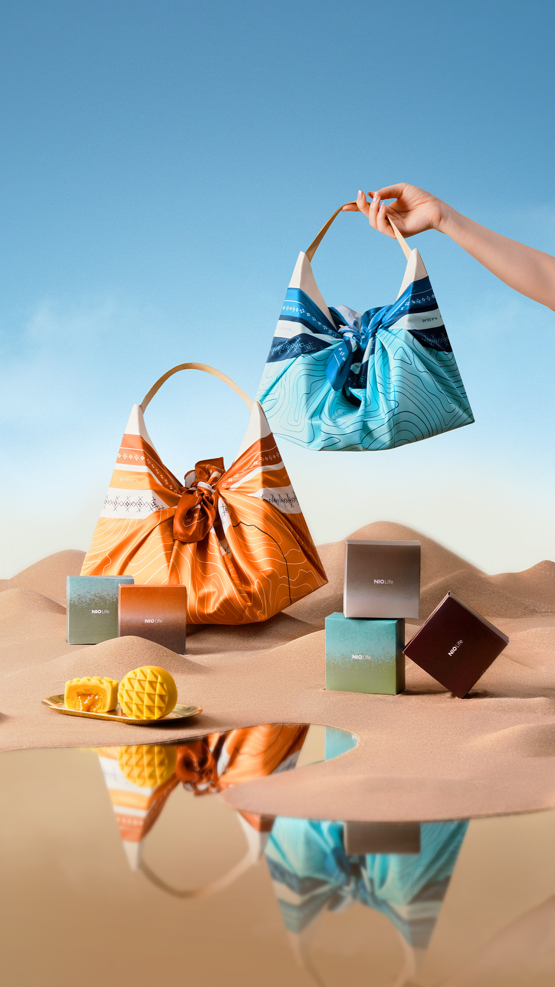 前两款同属“山河行”系列月饼礼盒,灵感来自“丝路行囊”,以风光地貌设计外观和饼皮造型。两款礼盒里分别是月饼和茶叶。