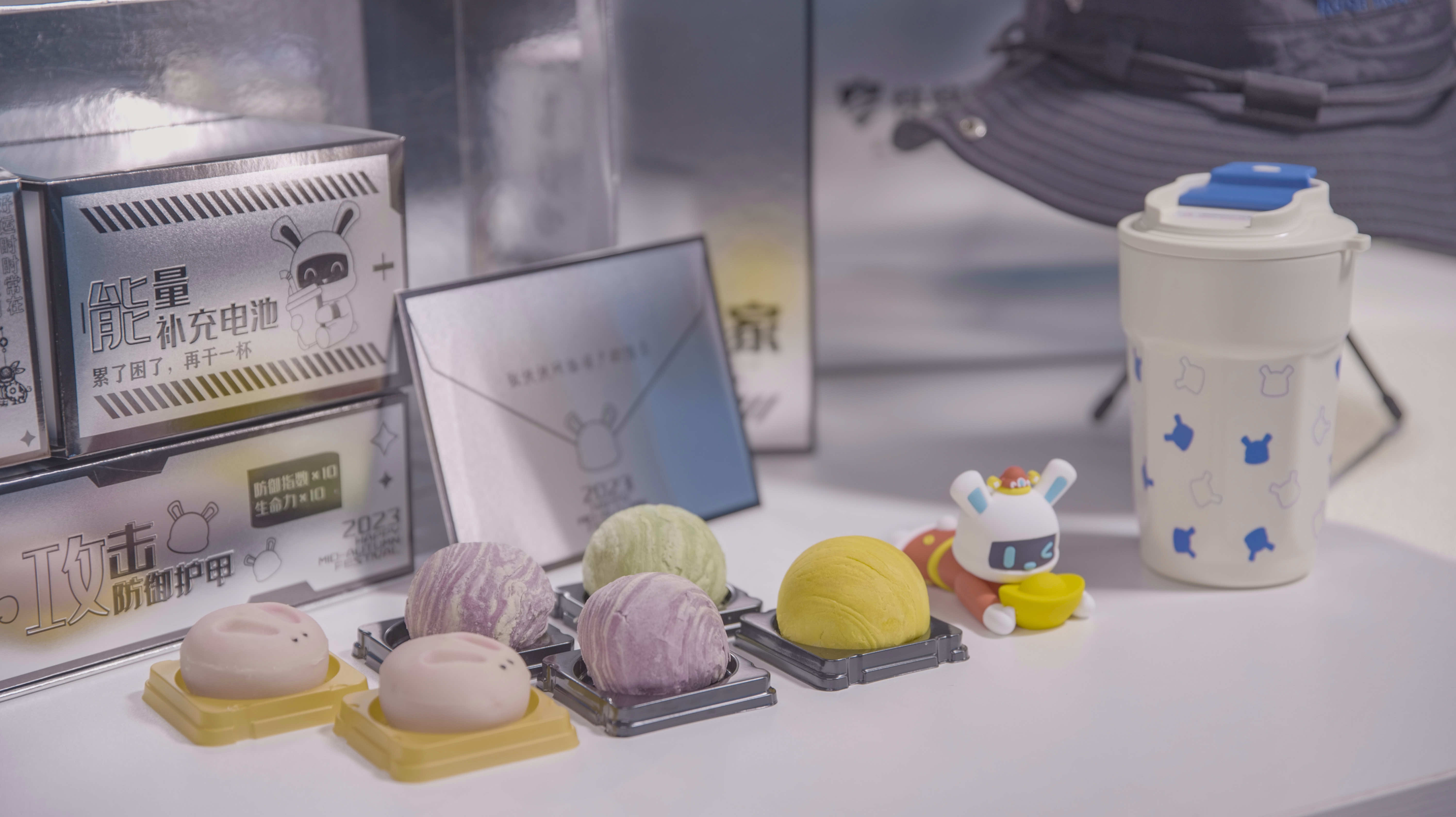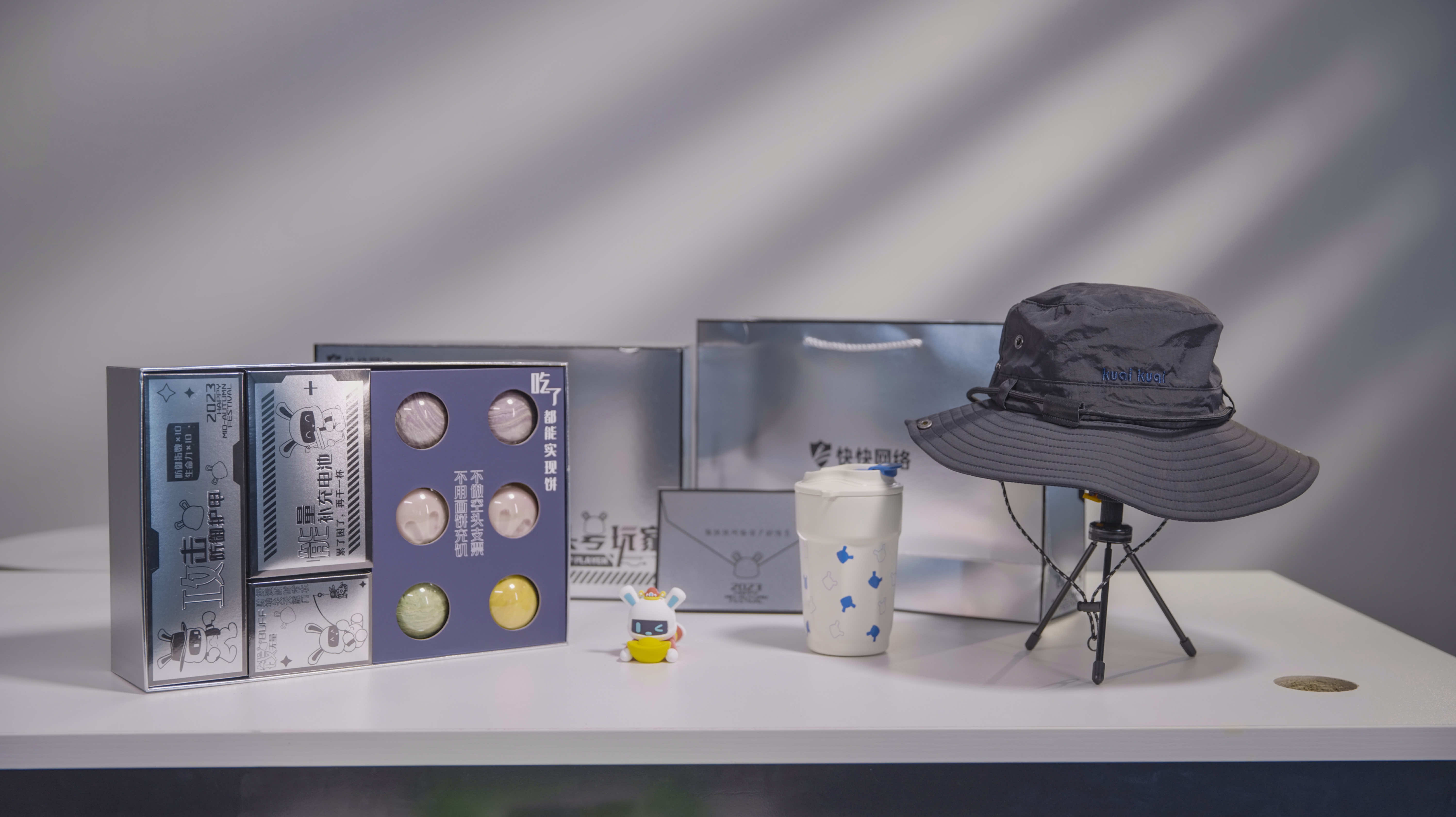 礼盒内含:快快兔水杯、登山帽、元宝快快兔定制摆件、各种口味的月饼