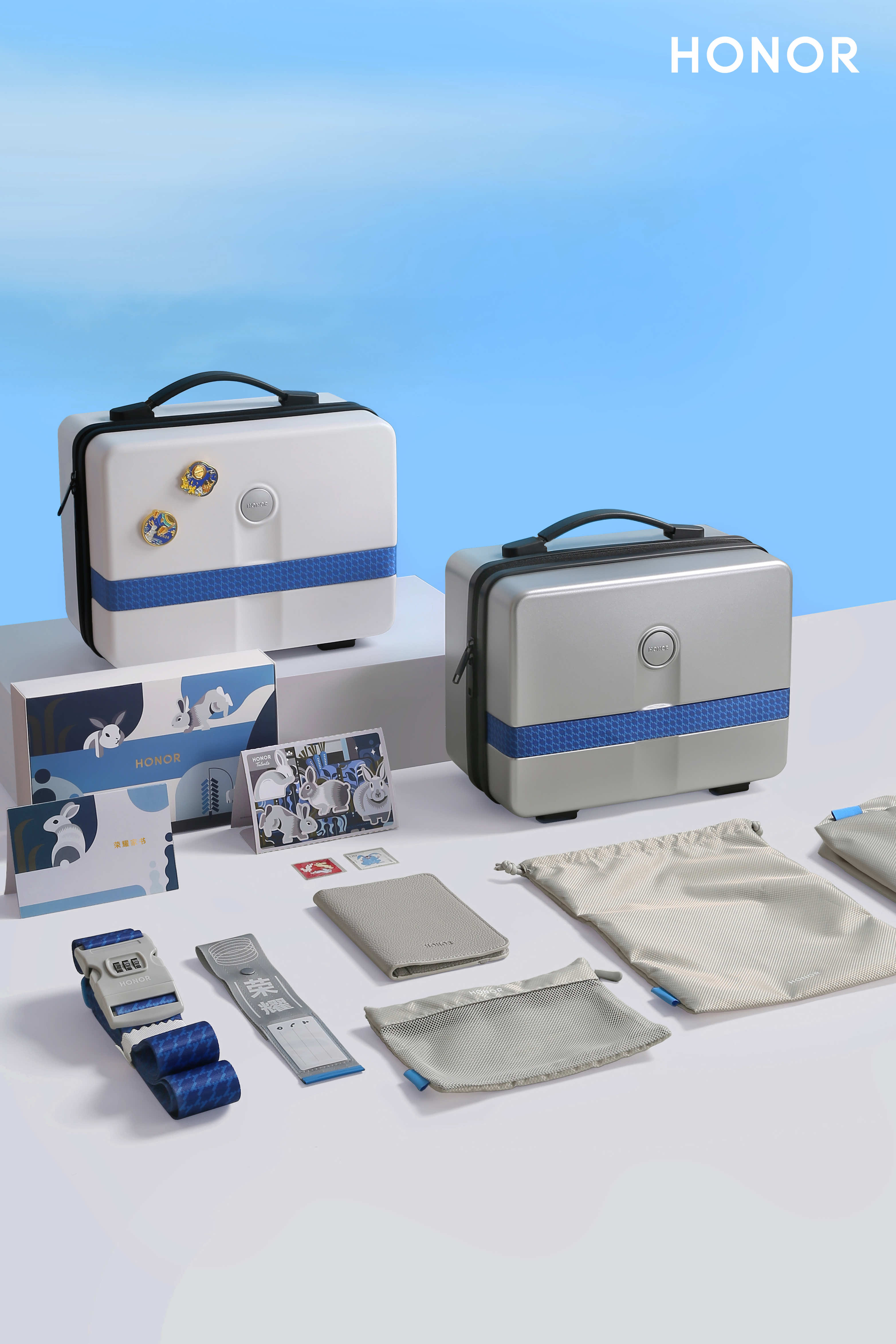 礼盒本身是一个手提箱,融合了品牌Monogram的元素设计。礼盒内除了有荣耀Logo的定制中秋月饼,还有一站式出游套组。