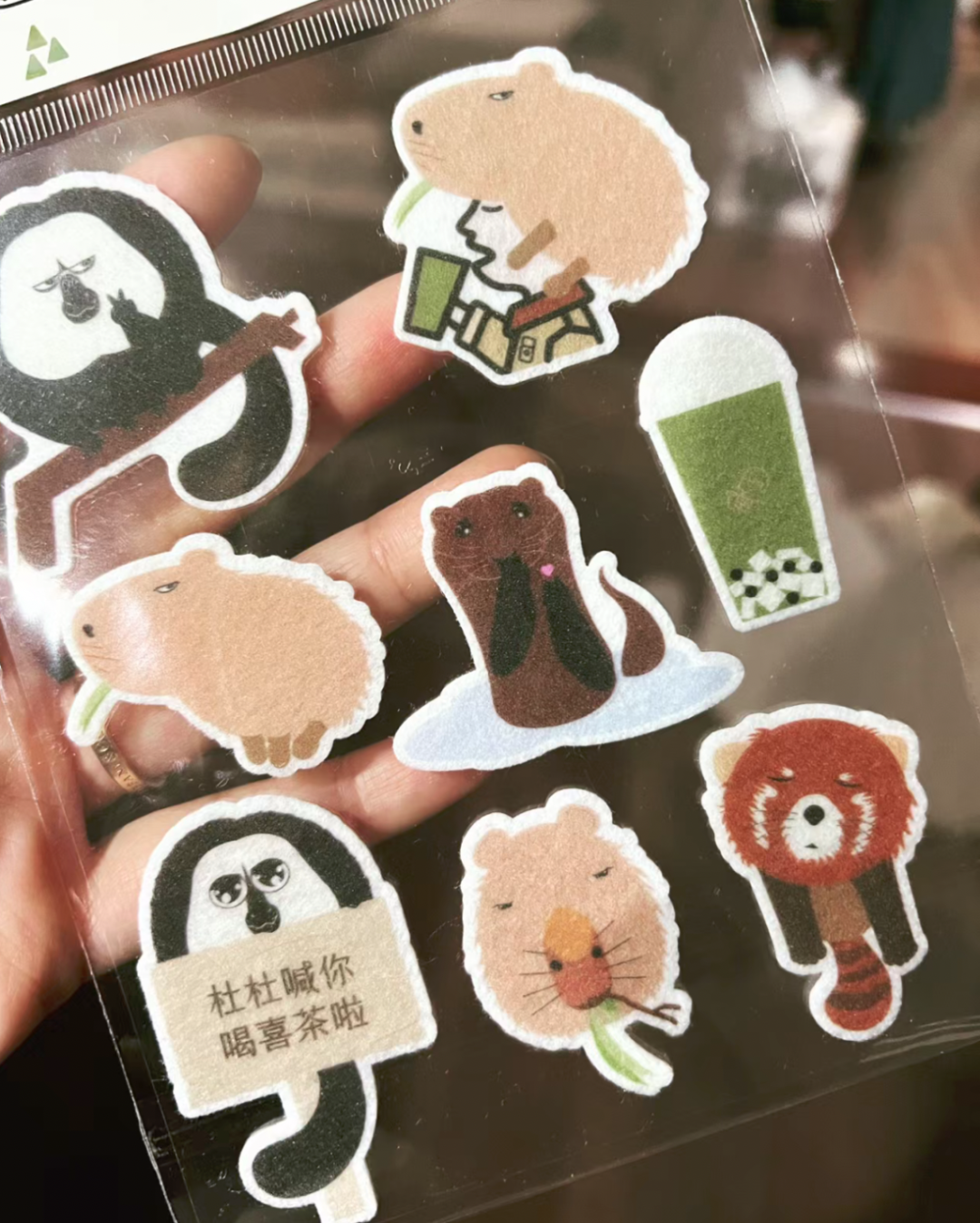 购买2杯的套餐,就可以免费得到一张毛毡贴纸。贴纸上除了有杜杜、杏仁,还有其它人气小动物。