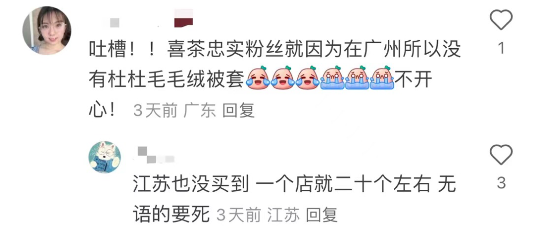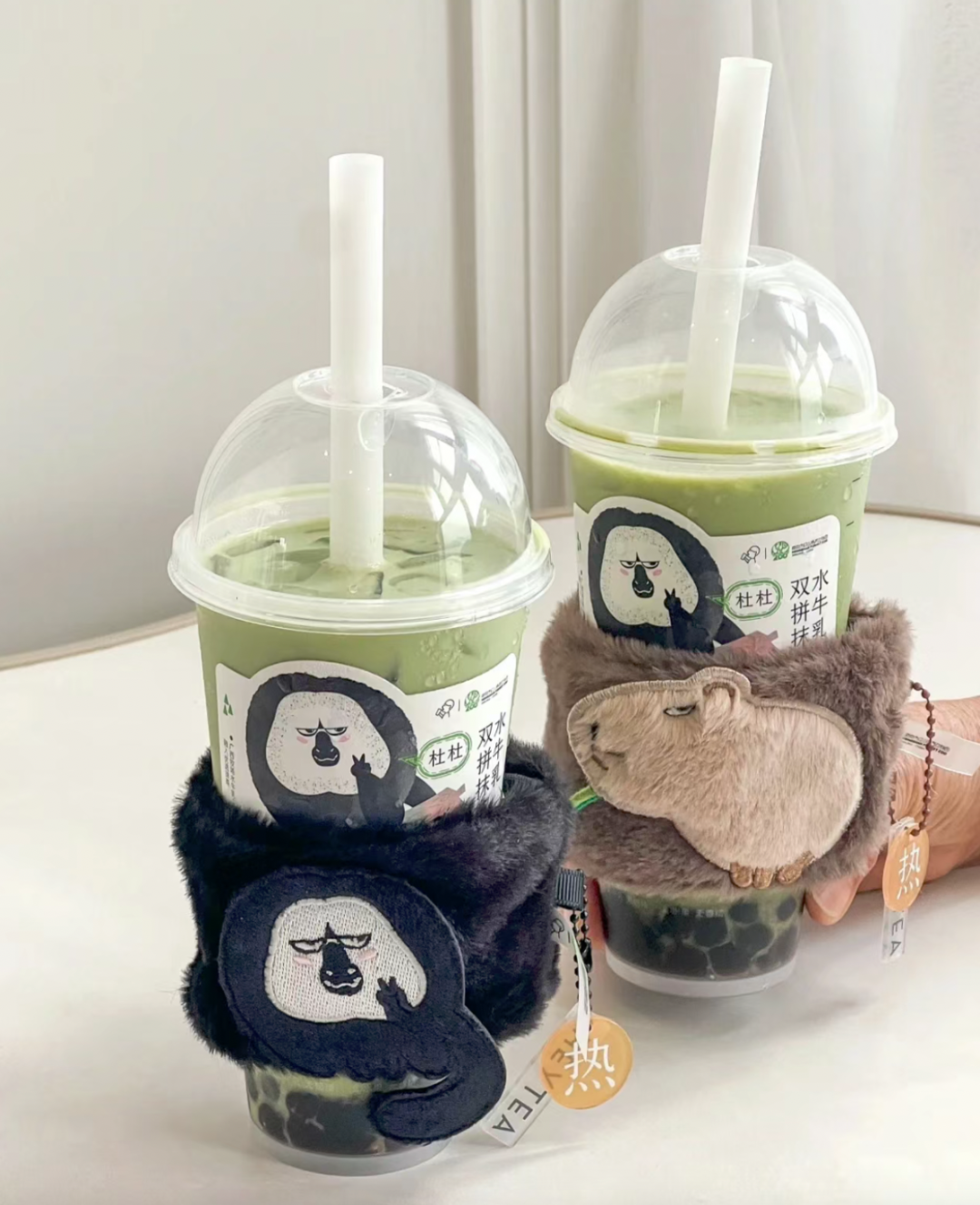 江苏地区的消费者还可额外获赠一只毛绒杯套。杯套分为杜杜款和杏仁款,毛茸茸的特别可爱,原计划持续赠送三天,结果第一天就被送完了。
