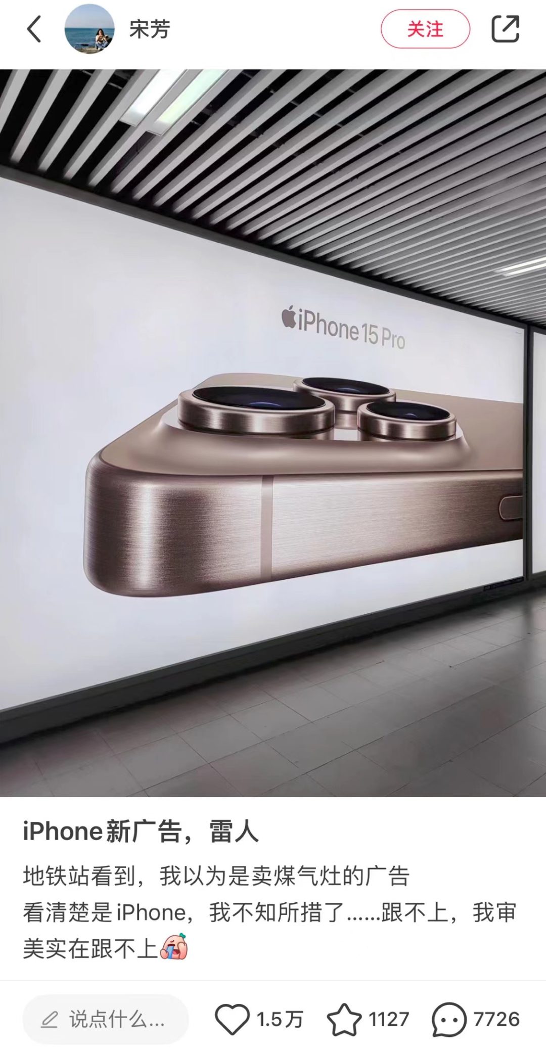 iphone15开启发售,苹果也开始铺广告了。最近有网友吐槽,苹果的地铁海报,怎么看怎么像煤气灶?