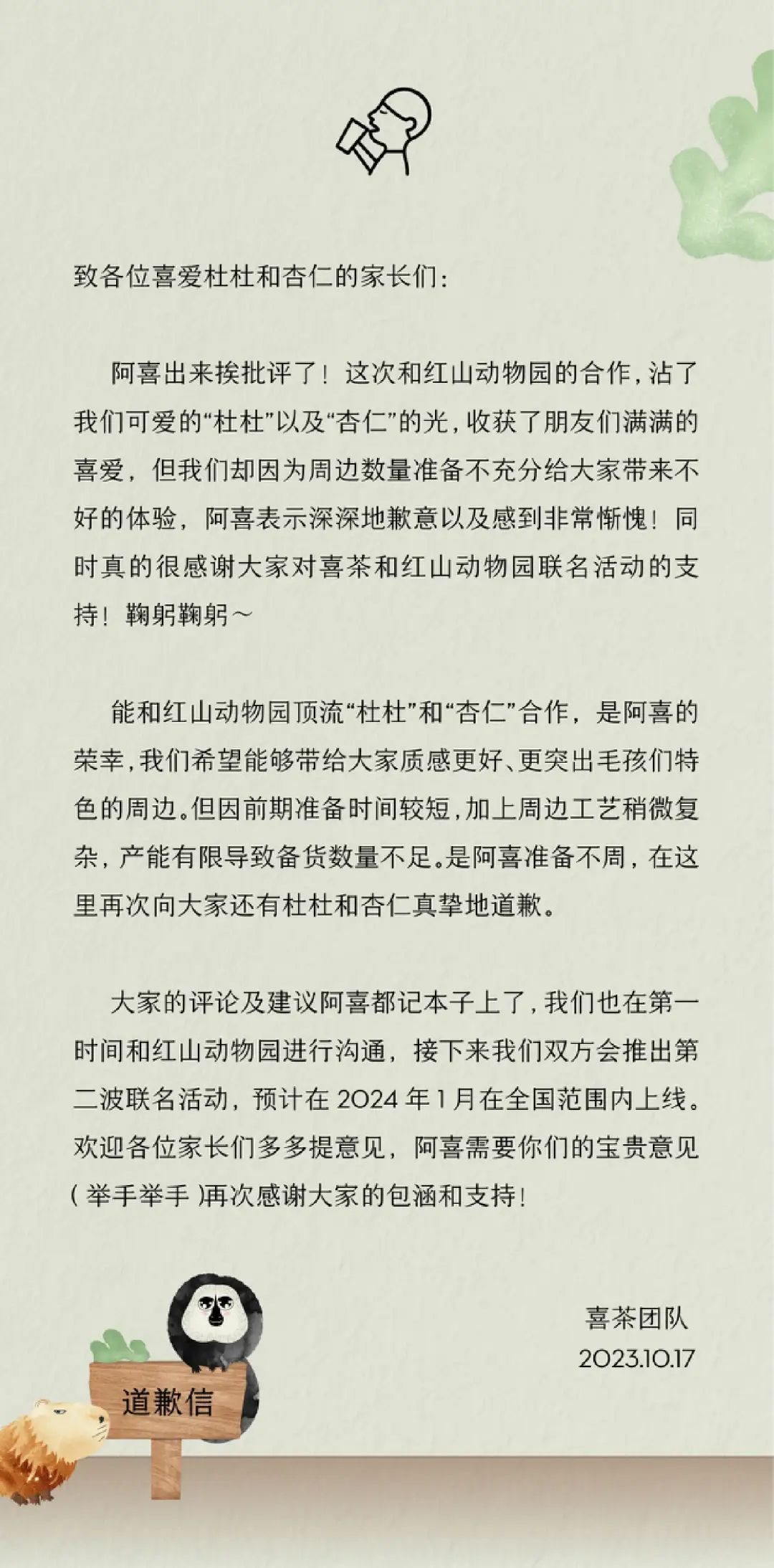 随后,喜茶的道歉也来得十分迅速。品牌官方账号发布了一封“致喜爱杜杜和杏仁的家长们”的信,称准备时间短,周边工艺复杂,产能有限,并透露预计2024年1月,将在全国范围内上线第二波联名活动。