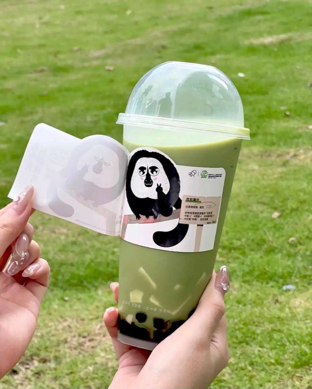杯子上的贴纸设计了两层,揭开第一层,白面僧面猴“杜杜”从犀利眼神变成了水汪汪的大眼睛,设计十分契合动物的性格特质——长相炸裂,但性格温柔。