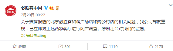 不仅如此,必胜客又多次陷入负面舆情,断送了人们对“舶来品”不够营养但绝对干净的刻板好印象。近年来,百胜集团的发展战略之一是抢占下沉市场。必胜客门店的快速扩张增加了管理难度,加大了食品安全的风险。