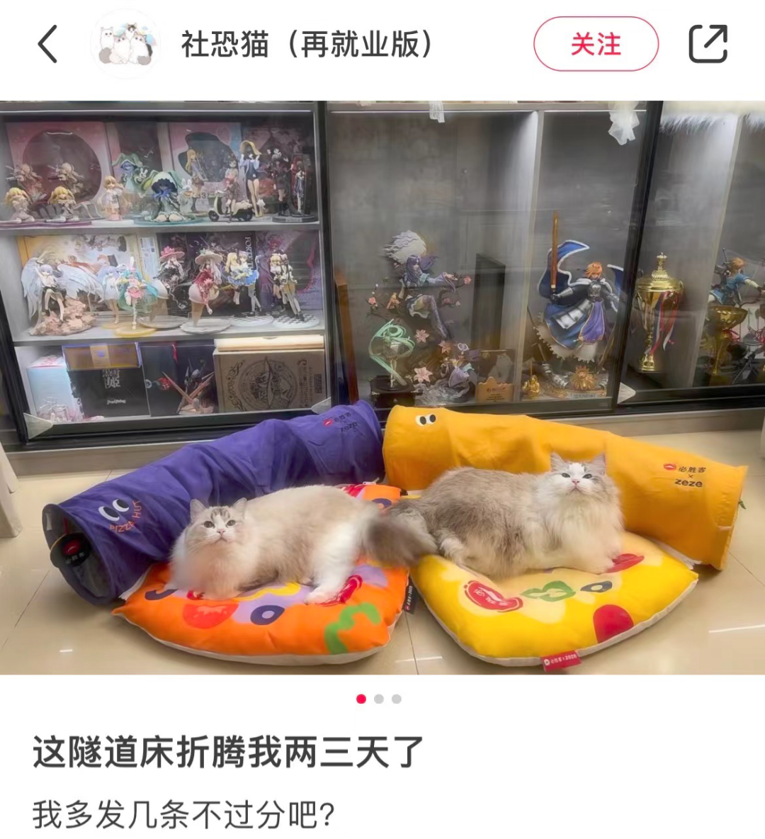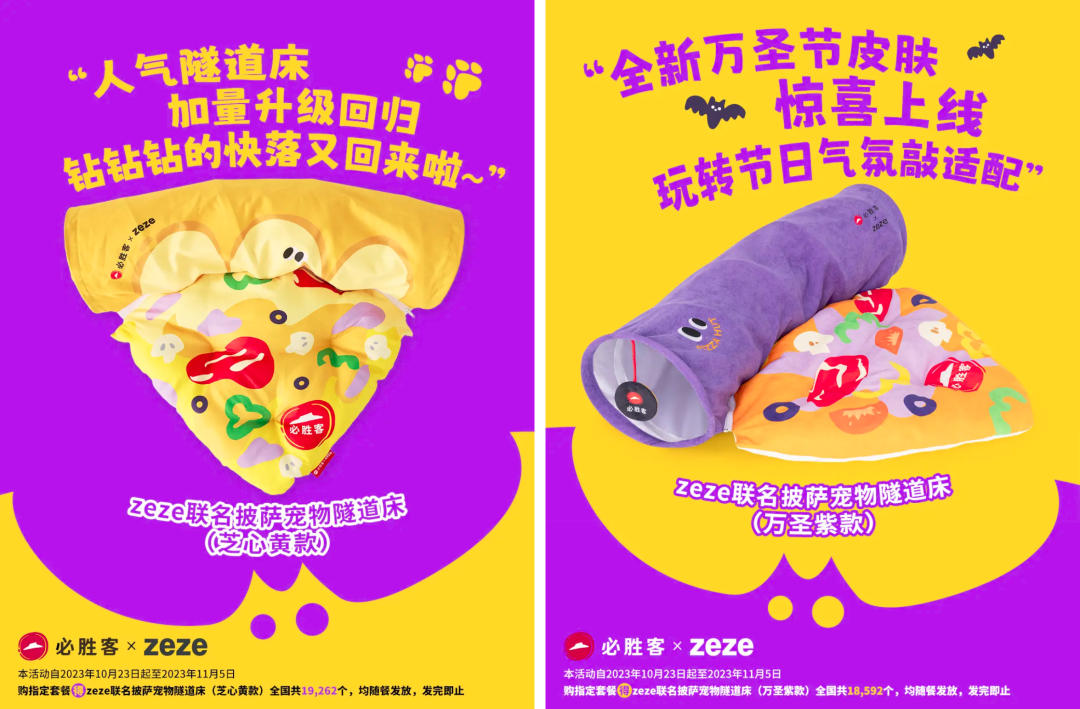 除了香菜猪耳比萨,必胜客还与宠物用品创意品牌zeze联名推出了周边宠物隧道床,有万圣紫、芝心黄两款。