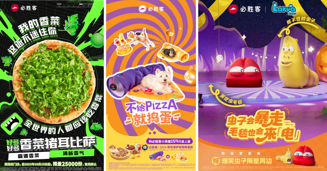 最近,小编发现有个品牌也在悄悄上“猛药”,它就是必胜客。临近万圣节,再加上双十一大促节点,必胜客不仅上新了奇葩口味“香菜猪耳比萨”,联名爆笑虫子IP,更是与宠物用品品牌zeze合作,推出了不少好玩可爱的周边。