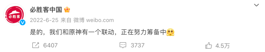 必胜客与游戏的联动,始于2019年的夏天。今年4月,与《原神》梅开二度合作之前,必胜客就已经和手游、网游、单机游戏等共计15款联动过。腾讯的英雄联盟,心动网络旗下的《香肠派对》,永航科技研发的《白夜极光》,Kong Studios开发哔哩哔哩代理的《坎公骑冠剑》等等,不限平台和制作方,必胜客疯狂讨好年轻人,积累合作经验,品牌最终在与人气游戏《原神》的联动中迎来高光时刻。cos游戏角色的玩家们走进必胜客门店,把吃披萨玩成了漫展活动。部分门店一度因为人数太多而暂停营业。