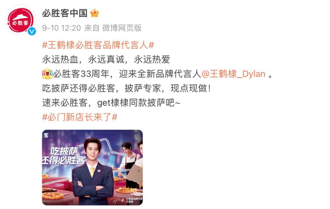 必胜客官宣品牌代言人的速度几乎保持在一年一位——2019年的张艺兴,2020年的赵丽颖,2021年的刘昊然。今年9月初,必胜客官宣人气演员王鹤棣为品牌代言人,同时庆祝品牌的33周年生日。借代言人官宣新动向,张艺兴带来新品薄脆系列,赵丽颖带来新春五福宴,刘昊然推必胜客app渠道,王鹤棣主推牛肉披萨,以粉丝人气带动,刺激更多消费者关注。
