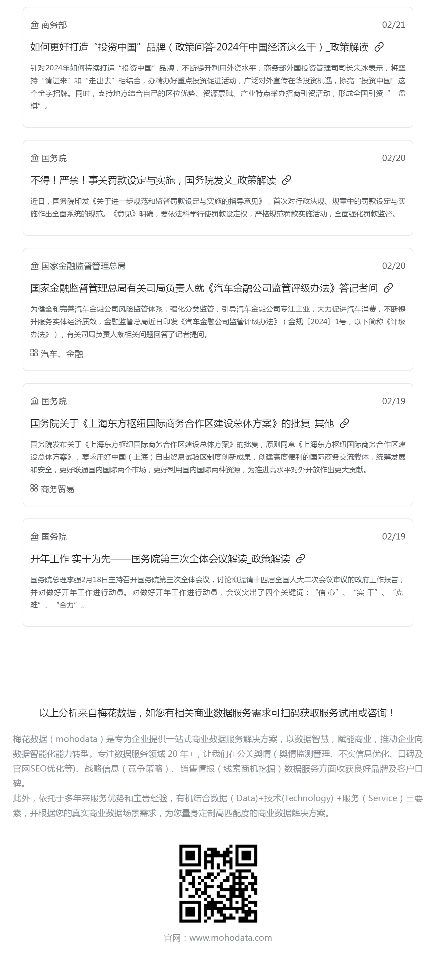 根据梅花数据舆情监测要政盘点统计,监测期间共收录重要政策信息共计39条,其中涉及金融、旅游、乡村振兴、政务、环保等多个领域,建议重点关注《关于进一步规范和监督罚款设定与实施的指导意见》、《汽车金融公司监管评级办法》等政策。