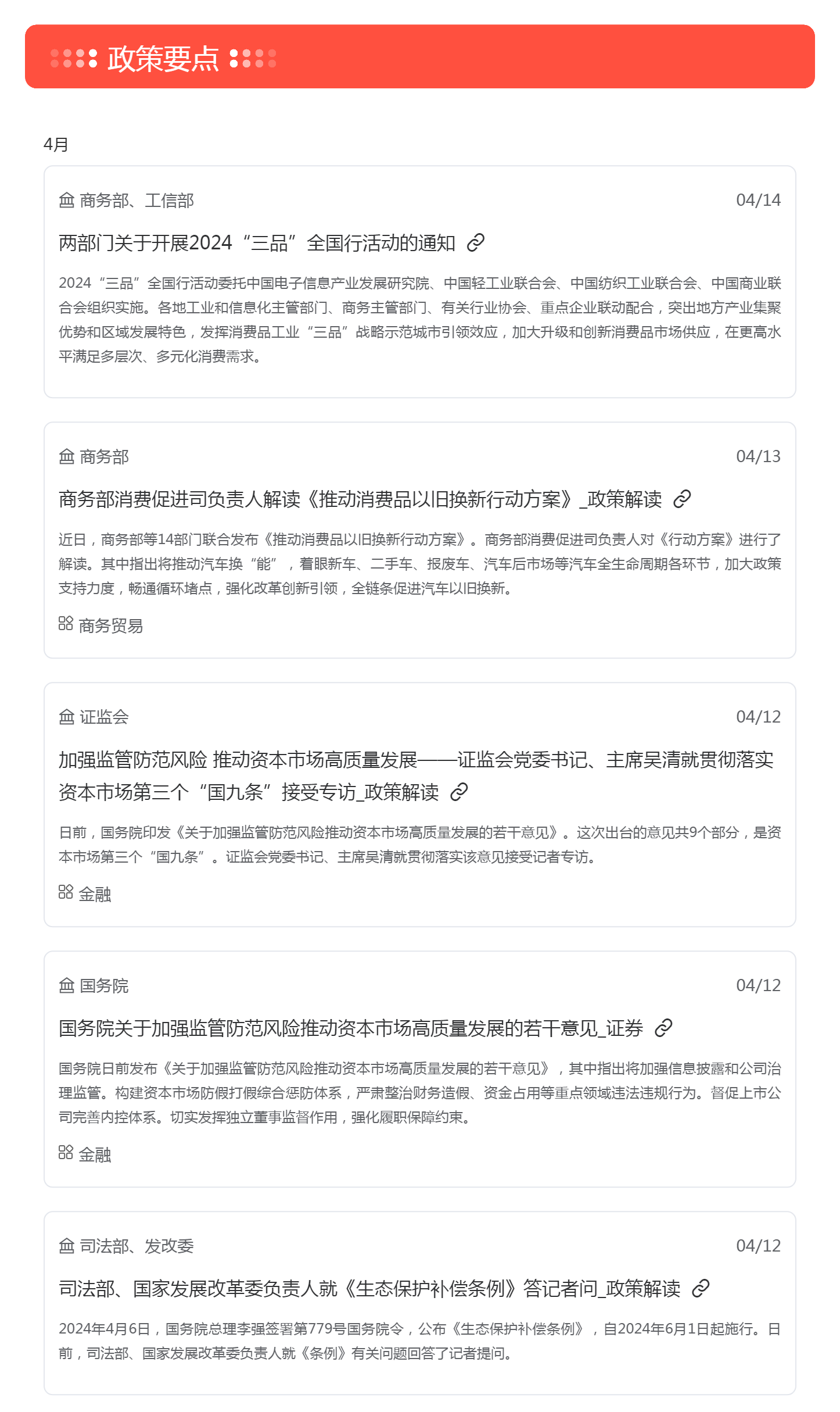 根据梅花数据舆情监测要政盘点统计,监测期间共收录重要政策信息共计89条,其中涉及金融、能源、粮食、消费升级、环保等多个领域,建议重点关注《关于加强监管防范风险推动资本市场高质量发展的若干意见》、《生态保护补偿条例》等政策。