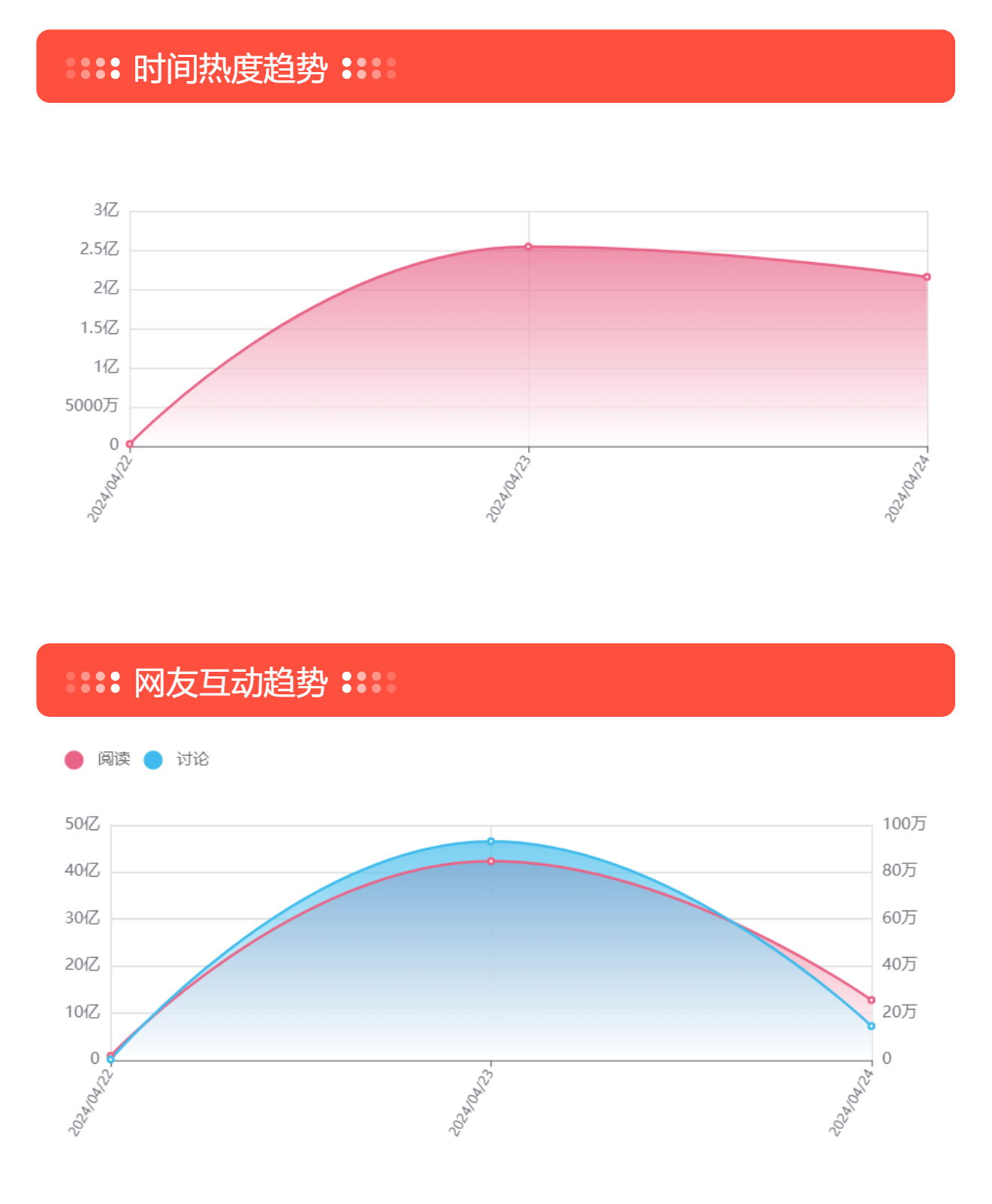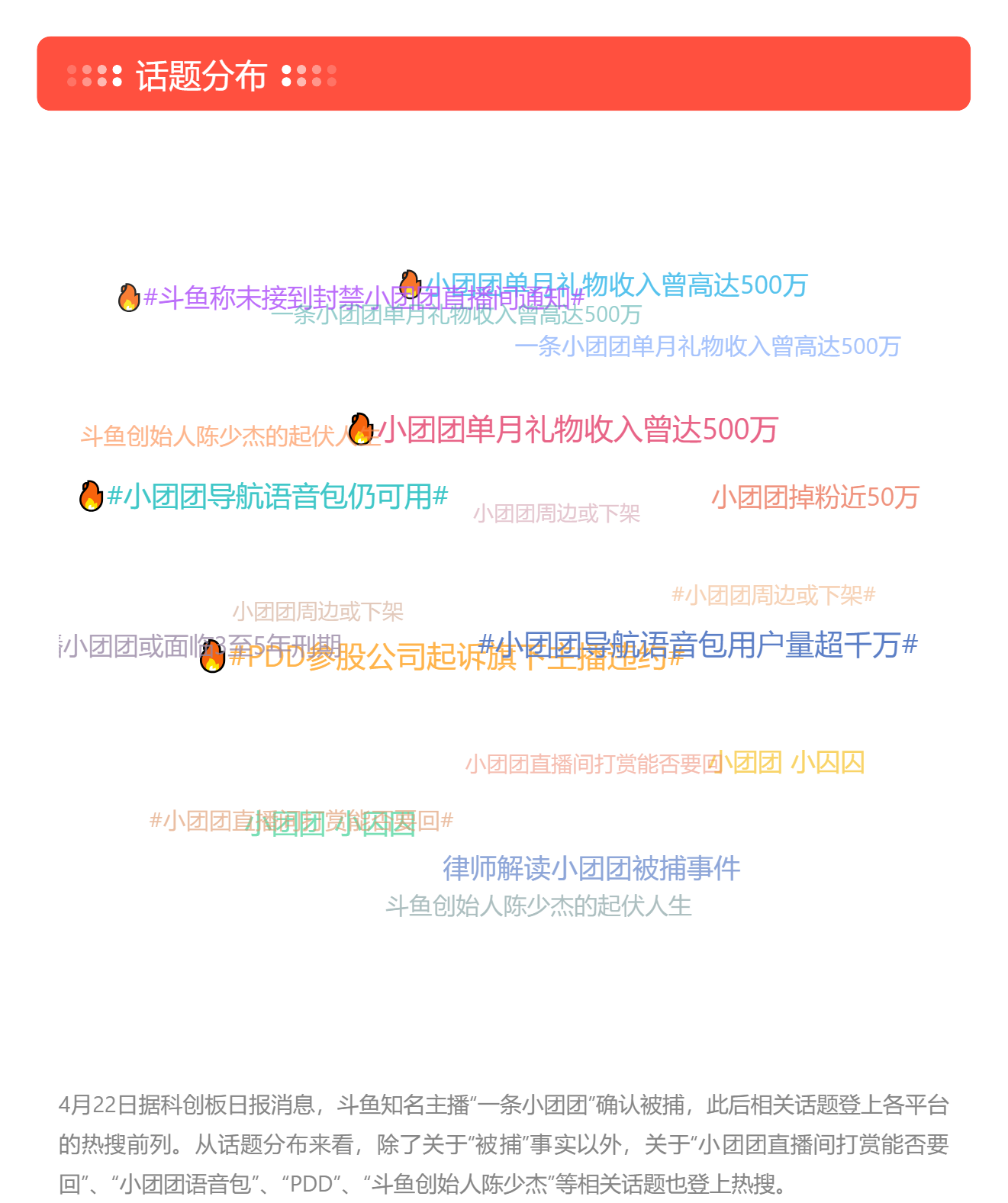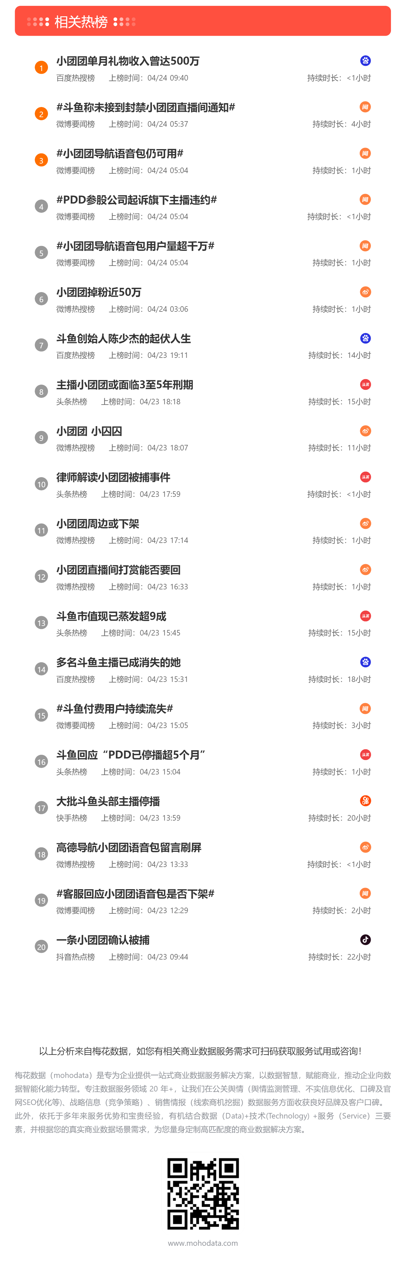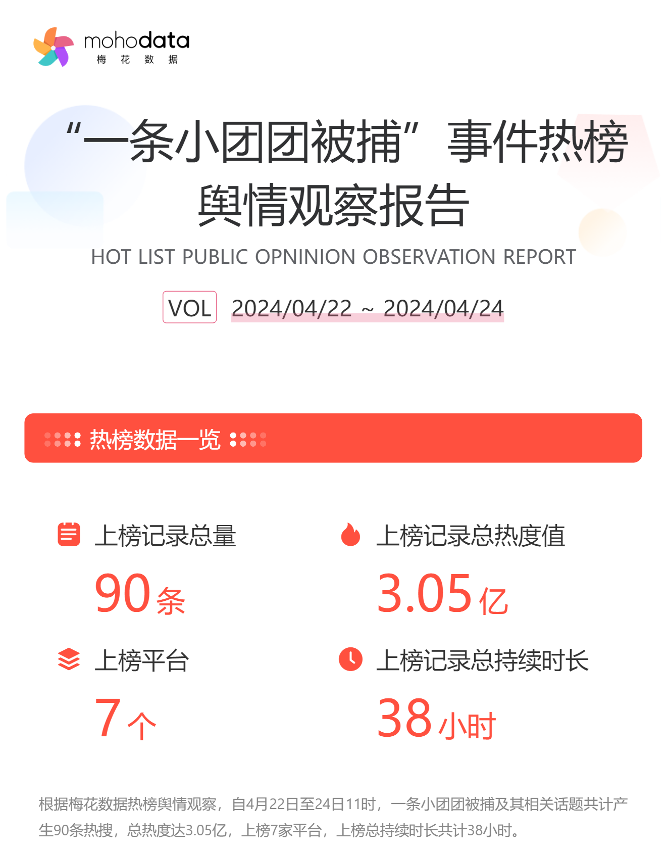 根据梅花数据热榜舆情观察,自4月22日至24日11时,一条小团团被捕及其相关话题共计产生90条热搜,总热度达3.05亿,上榜7家平台,上榜总持续时长共计38小时。