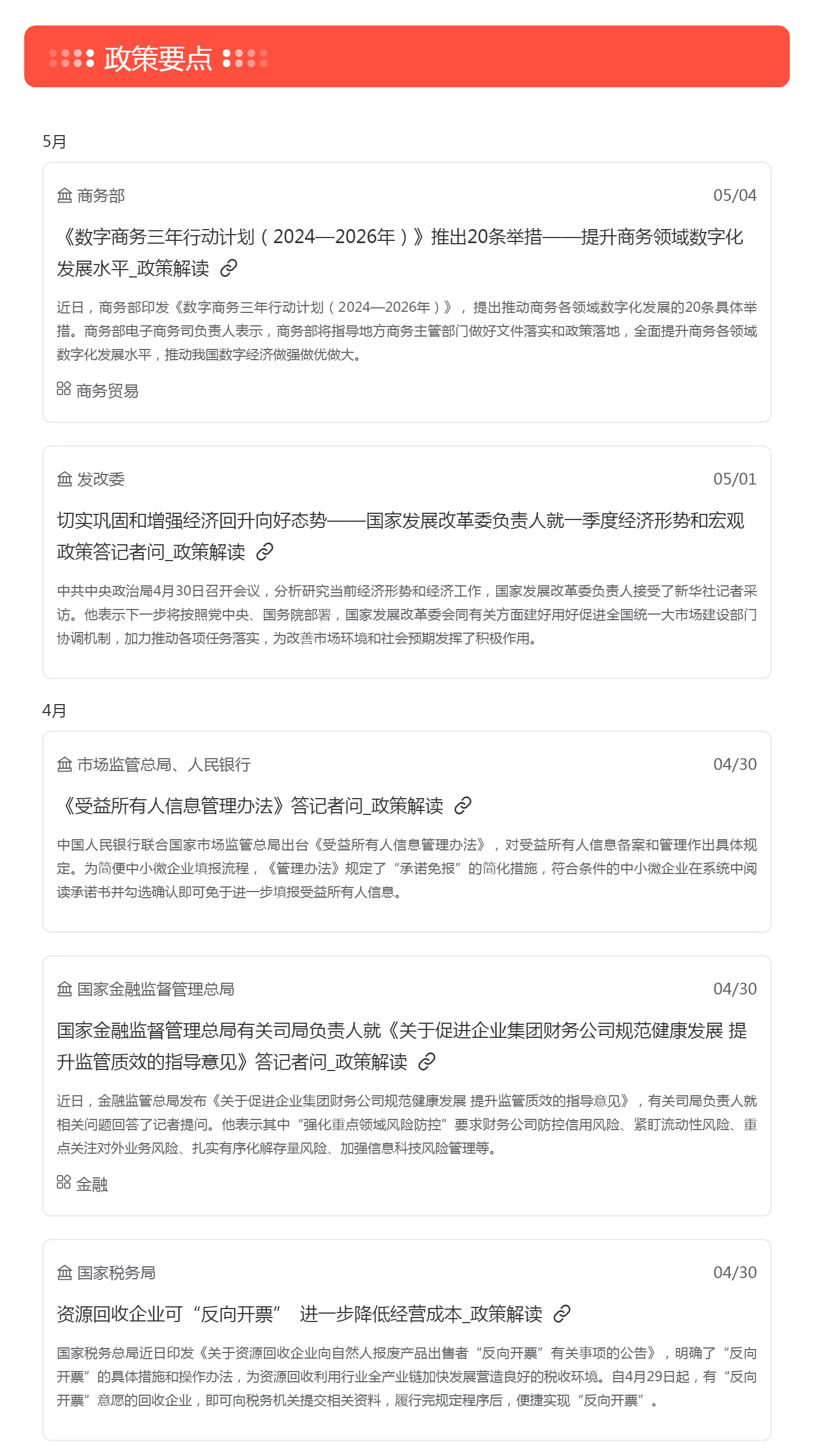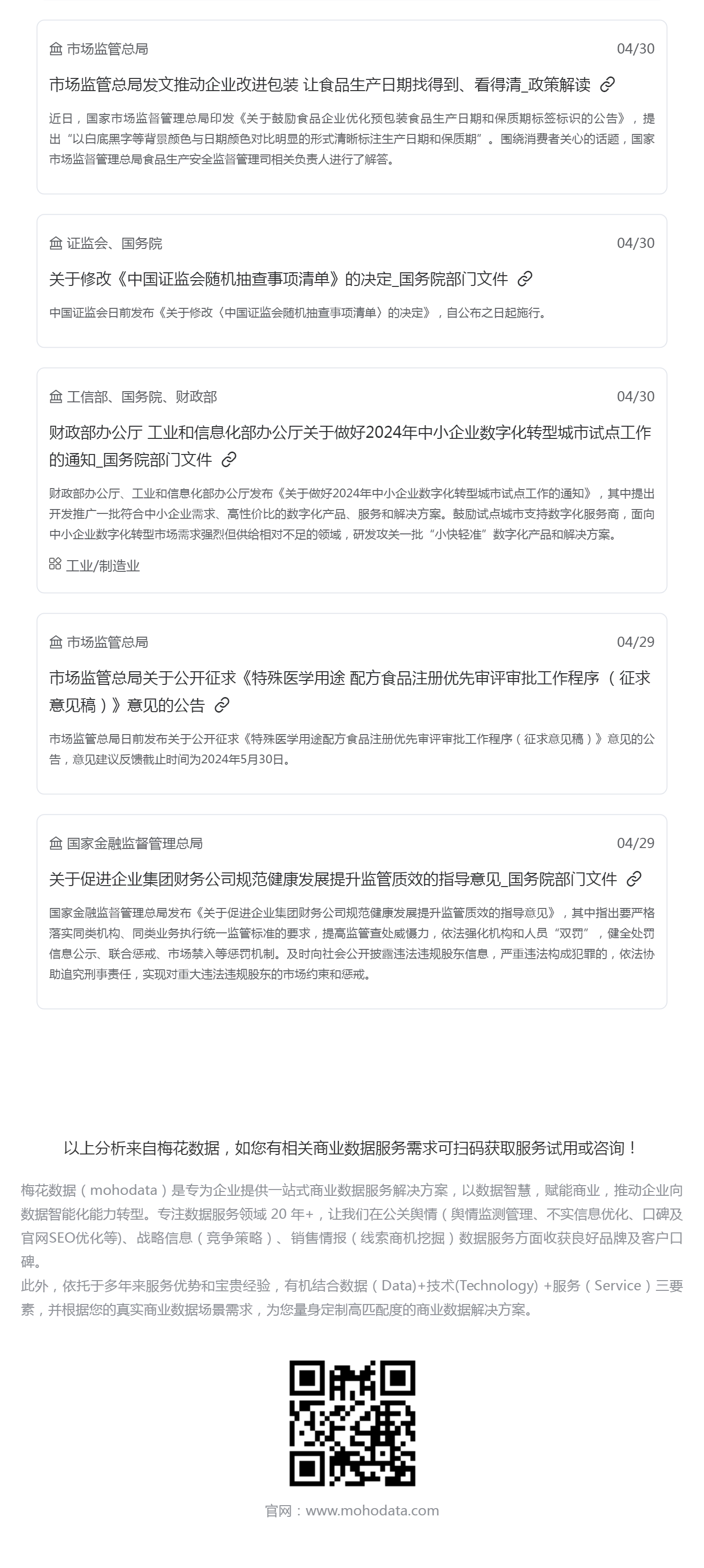根据梅花数据舆情监测要政盘点统计,监测期间共收录重要政策信息共计46条,其中涉及金融、商务、食品、医疗等多个领域,建议重点关注《受益所有人信息管理办法》、《关于促进企业集团财务公司规范健康发展 提升监管质效的指导意见》等政策。