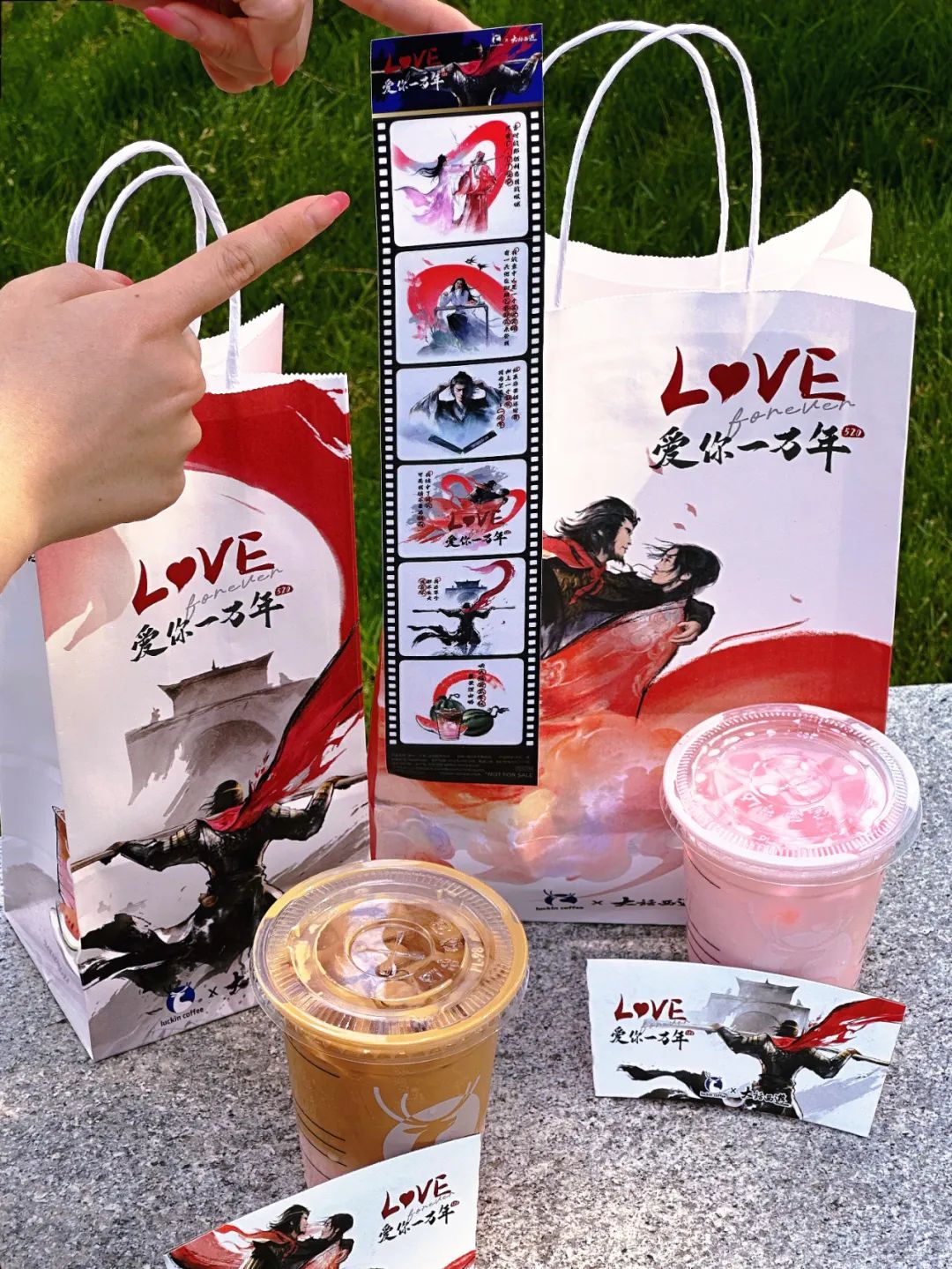 同时,瑞幸还推出了周边物料电影联名款纸杯套、纸袋,以及台词胶片贴纸,重现经典台词和画面。