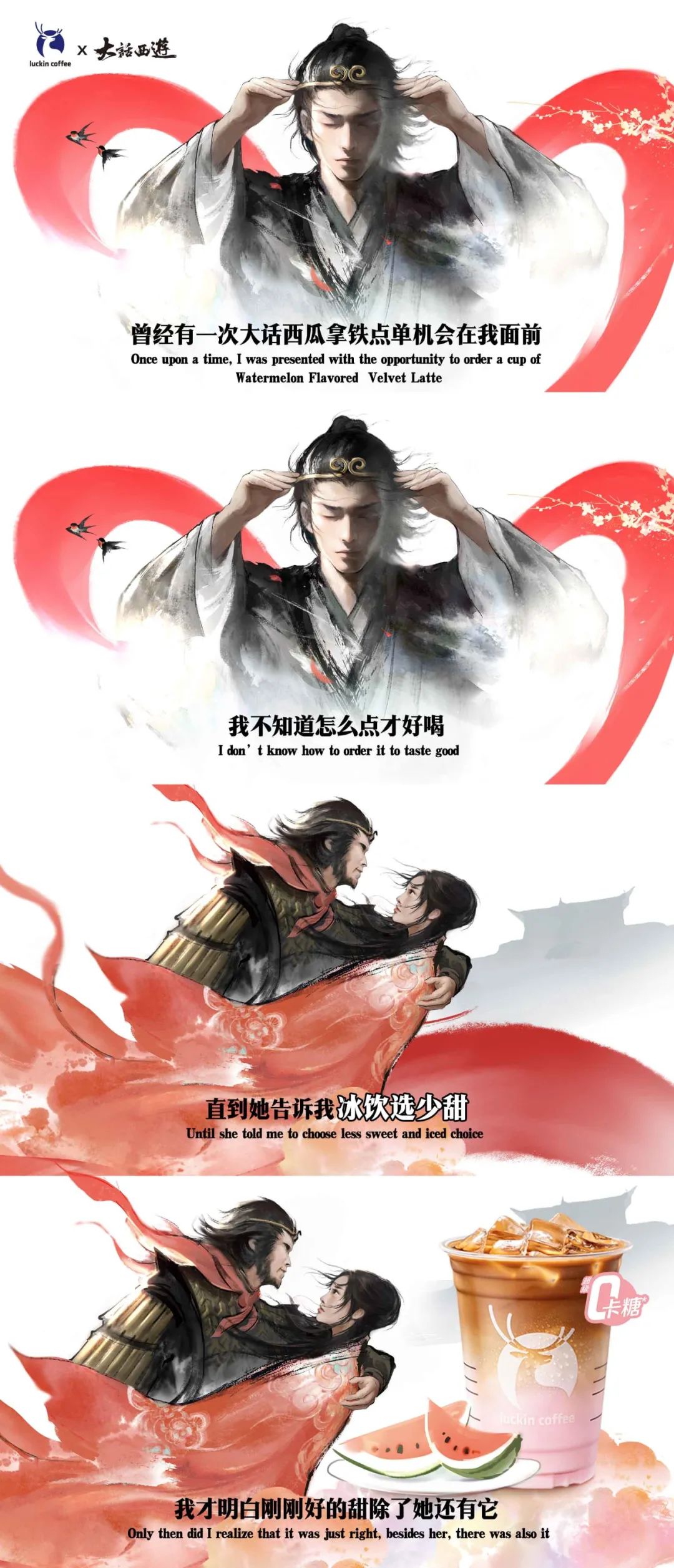 品牌玩梗电影经典台词。至尊宝不知道怎么点大话西瓜拿铁,直到紫霞仙子告诉他要“冰饮少甜”,他才明白原来这样才是刚刚好的甜。