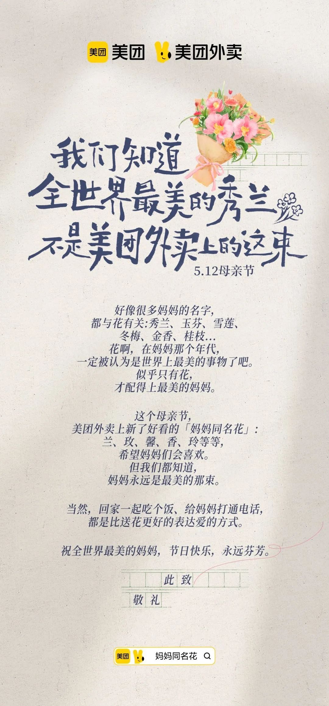 今年母亲节,美团外卖再度回归到“花”的主题上,这次,平台从妈妈们的名字入手,蝴蝶“兰”,郁“金香”,康乃“馨”,平台号召大家挑一束“同名花”送给比花更美的妈妈。这一封给平台用户的“信”也写得十分出彩。
