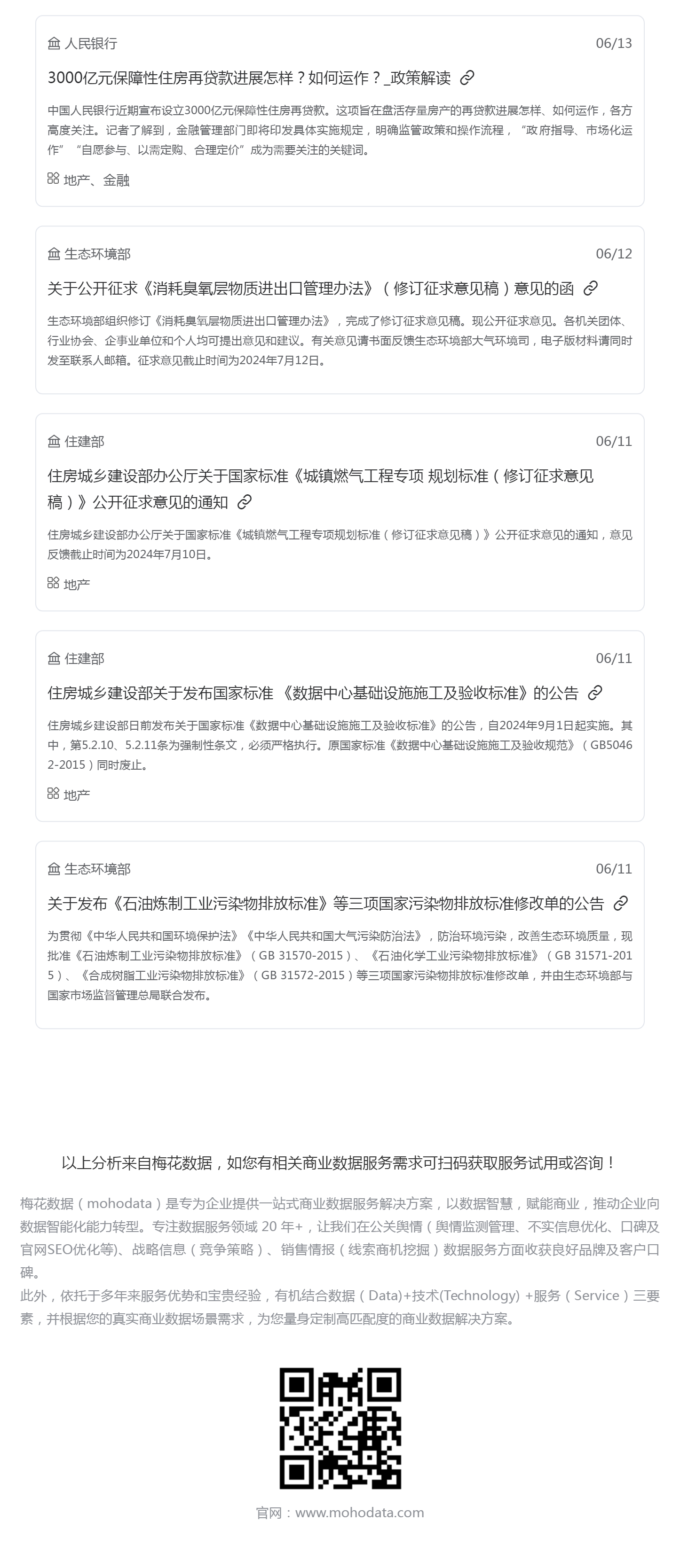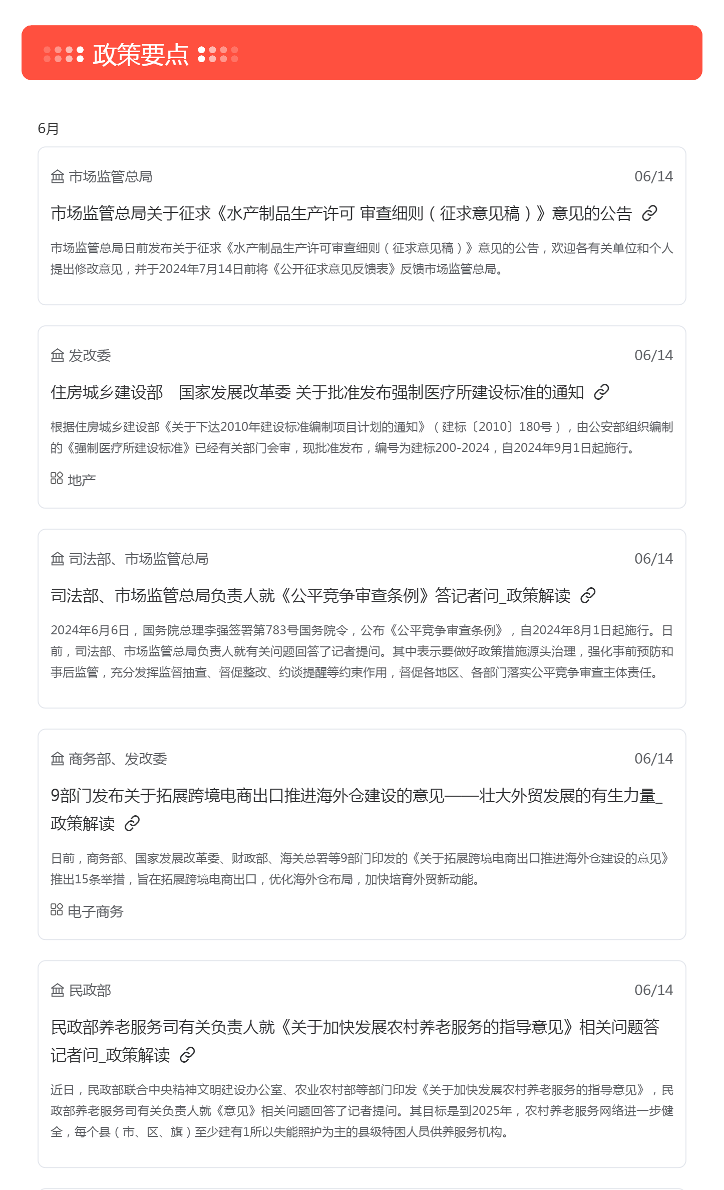 根据梅花数据舆情监测要政盘点统计,监测期间共收录重要政策信息共计56条,其中涉及医疗、农业、环保、外贸等多个领域,建议重点关注《公平竞争审查条例》、《关于拓展跨境电商出口推进海外仓建设的意见》等政策。