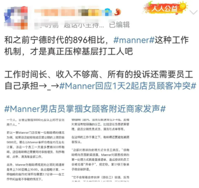 随后,#Manner员工月薪约5000元##Manner员工可能被情绪劳动绑架了#等词条也冲上热搜。Manner咖啡似乎陷入了负面舆情中。