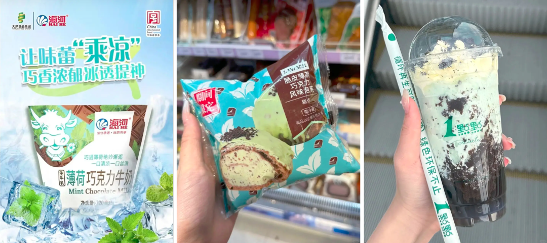 除了德芙、绿箭这两个来自玛氏旗下的品牌,海河、罗森便利店分别推出了薄荷巧克力口味的牛奶、泡芙,一点点推出了奥利奥薄荷冰沙,还有盒马近日回归的薄巧生牛乳饮品等等。