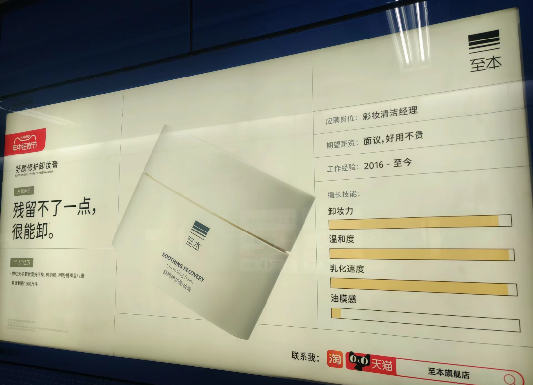 继去年618至本在地铁站投放了“真的,会卸”“千万,温和”广告海报后,今年六月,至本又为自己的明星产品洗面奶和卸妆膏在地铁站投了个简历。