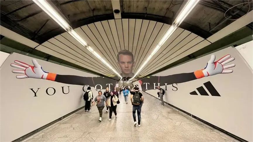 来自拜仁慕尼黑足球俱乐部、被誉为“欧洲足坛第二位出战八届大赛的门将”的足球运动员曼努埃尔·诺伊尔(ManuelNeuer)在地铁站通道里展开双臂,用“拜仁门神”的姿态诠释阿迪达斯今年的新slogan“You got this”。