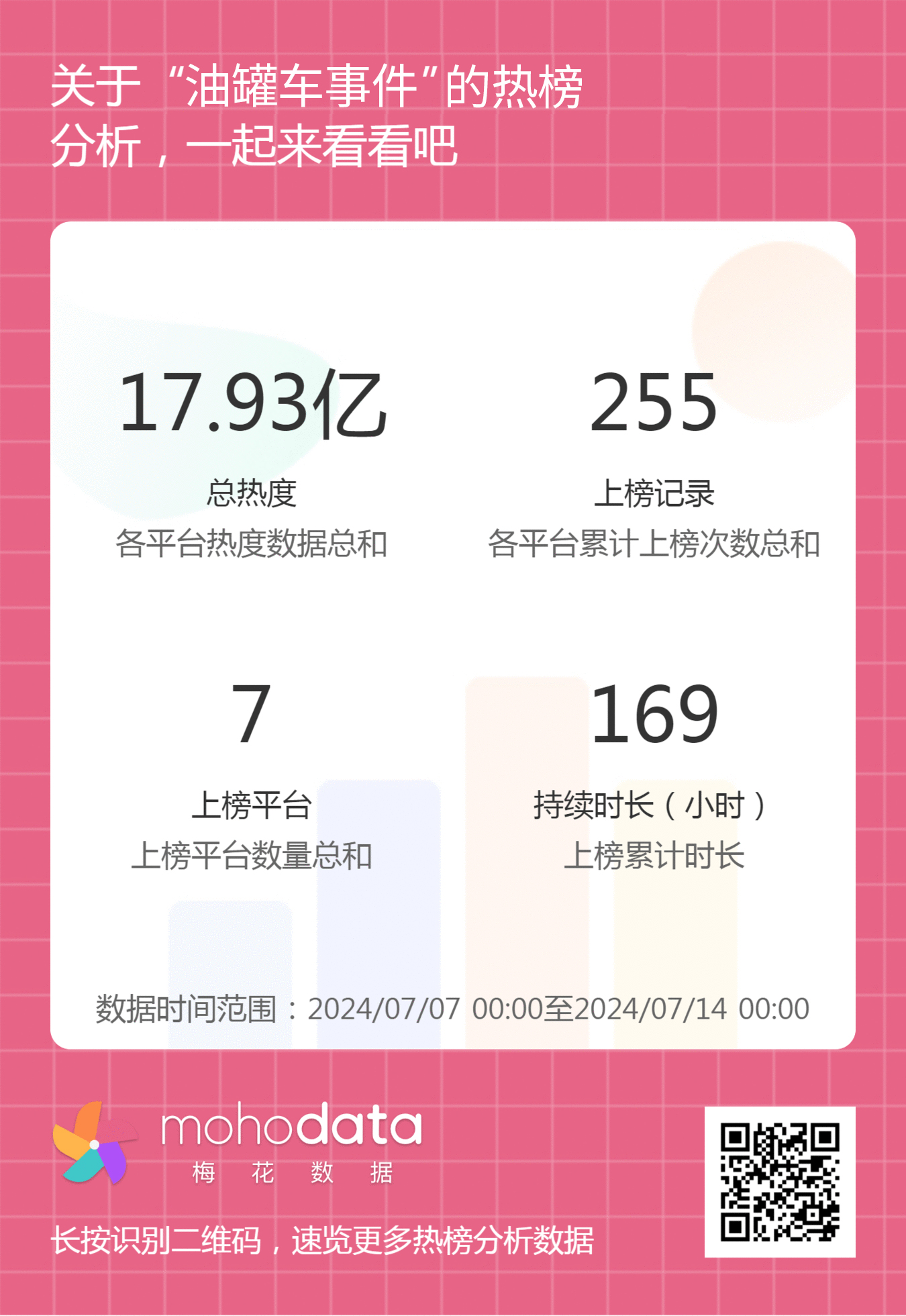 热搜方面,此次油罐车事件相关热搜热度总计17.93亿,上榜记录255次,上榜平台7家,持续时长169小时。详情可扫描以下二维码查看。
