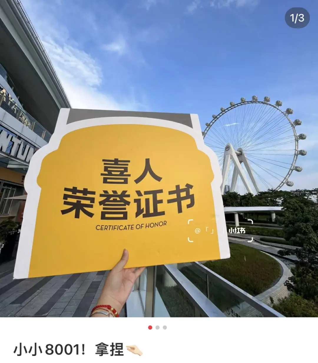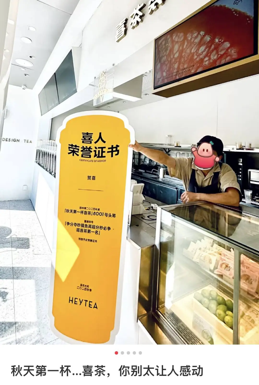 喜茶搞起显眼包操作,为第一个买到「秋天第一杯奶茶」的喜人颁发「大」奖。立秋当天,夺得各门店第8001号订单的顾客可获得1.5m高的巨型证书,喜提「争分夺秒摸鱼高超分秒必争·喝喜茶第一名」荣誉称号。如此「拉风」的秋日出街单品,让社牛们纷纷摩拳擦掌。