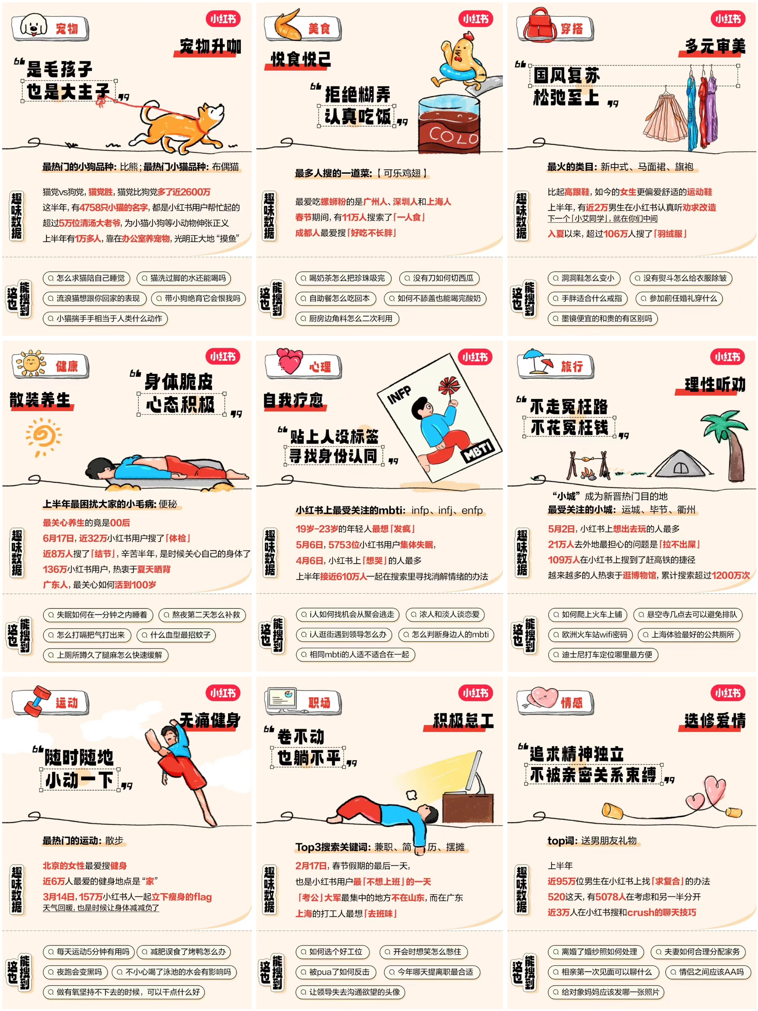 小红书联合DT商业观察,根据2024上半年小红书的搜索数据,发布小红书年中搜索报告,揭秘隐藏在搜索记录中的十大年轻人洞察。报告从身心健康、时尚娱乐、工作学习等角度总结出当代人的生活趋势,从这些趣味数据中我们可以窥见年轻群体既要躺也爱卷,发疯中带着几分人间清醒的精神状态。