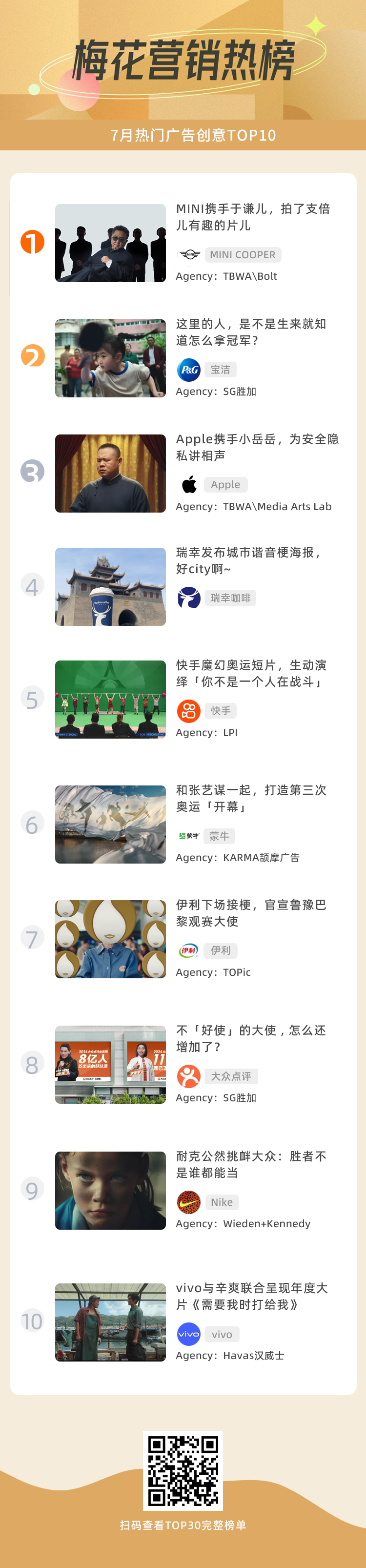 点此 即可查看7月完整版TOP30榜单,梅花营销热榜月度前十作品将直接入围 梅花创新奖「年度创新作品」的候选名单,恭喜本期所有上榜案例。也欢迎大家在评论区留下你心中的最佳案例,为心仪的创意拉票