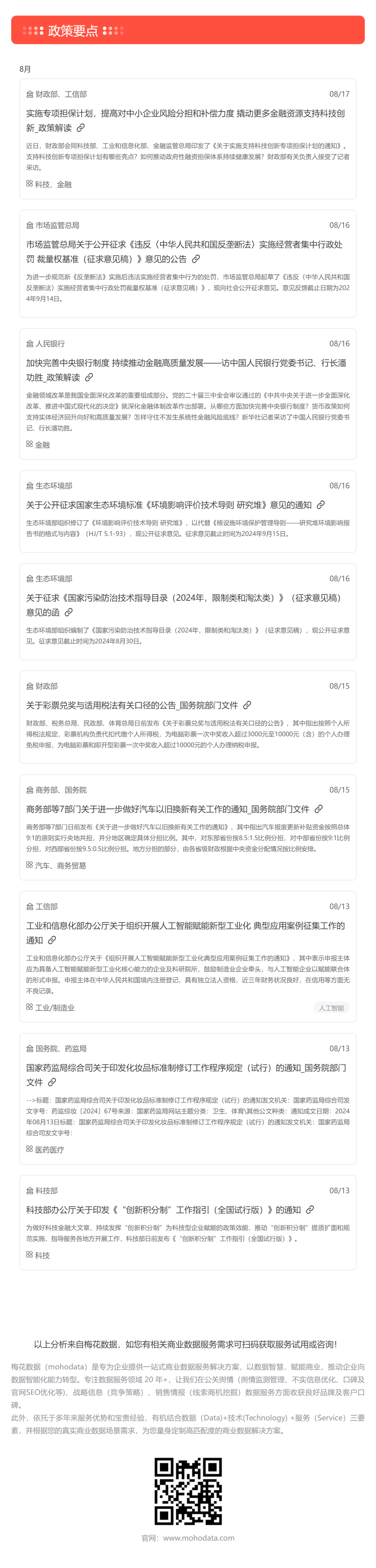 根据梅花数据舆情监测要政盘点统计,监测期间共收录重要政策信息共计69条,其中涉及环保、汽车、反垄断、人工智能等多个领域,建议重点关注《国家污染防治技术指导目录(2024年,限制类和淘汰类)》、《关于进一步做好汽车以旧换新有关工作的通知》等政策。