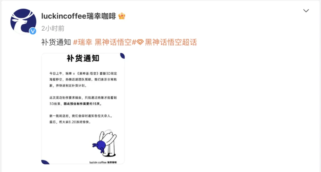 8月19日,瑞幸咖啡与国内首款3A游戏《黑神话:悟空》联名产品“黑神话腾云美式”发布,消费者购买套餐,可限量获赠3D限定海报光栅卡、3款联名杯套等周边,这吸引了许多网友早起前往瑞幸门店兑换或购买活动套餐。