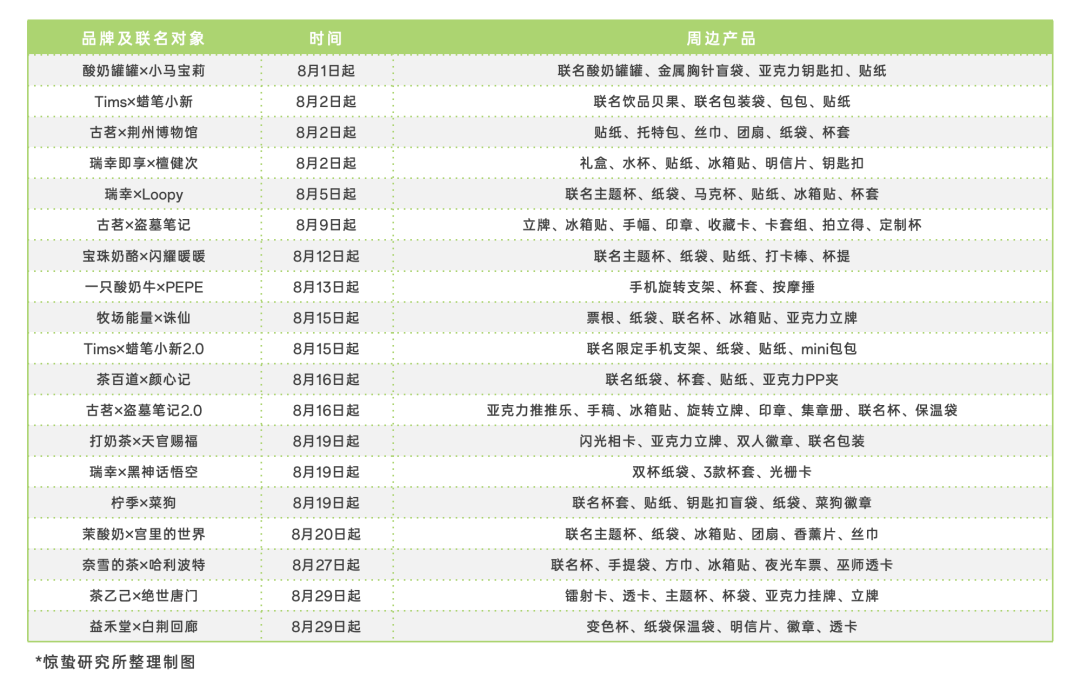 这一群体最看中什么?自然是印着角色的包装袋、角色贴纸和立牌,而“售罄”更是成为联名中的常见现象。惊蛰研究所在整理部分茶饮品牌8月的联名活动时发现,市面上联名周边已经不是过去“叠加logo”的排列组合,而是以主题杯、杯套、亚克力板和明信片为主的“周边大礼包”,搭配设置联名主题门店。