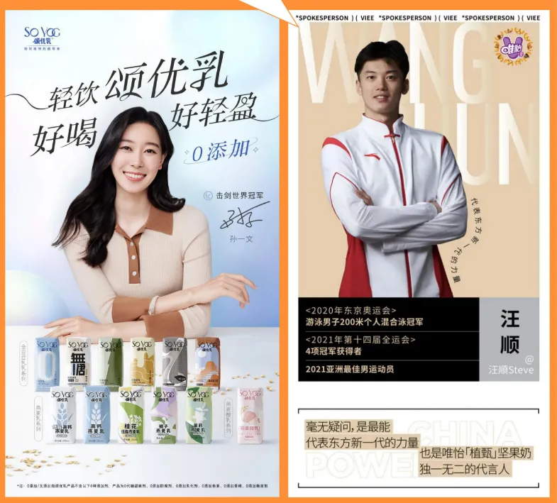 2021年,唯怡推出主打健康无糖的子品牌颂优乳,打造针对“轻体健康”“咖啡特调”“户外露营”等不同场景的产品,后来签约击剑奥运冠军孙一文作为代言人;2022年初,唯怡推出“植甄”坚果奶系列产品,签约游泳奥运冠军汪顺为代言人。