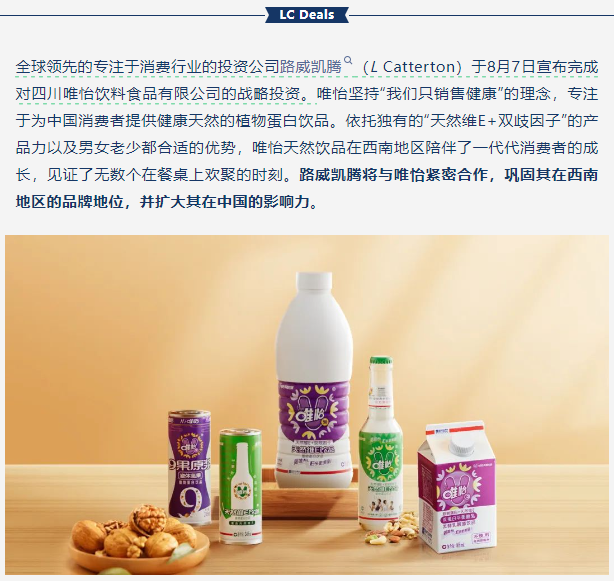 8月7日,LVMH集团旗下的投资公司路威凯腾(L Catterton),宣布完成对植物蛋白饮品品牌唯怡的战略投资,投资金额暂未公开。