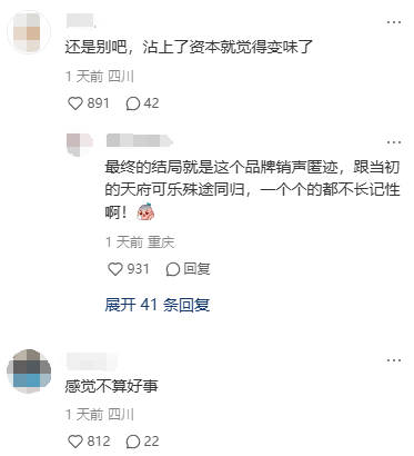 这次唯怡得到路威凯腾投资的消息传出,就有网友历数因为被收购而逐渐销声匿迹的本土饮料,比如天府可乐。