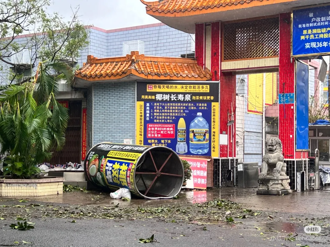 台风也喜欢椰树,也是从小喝到大,这下喝完还乱丢垃圾,在椰树门口扔了个大易拉罐。