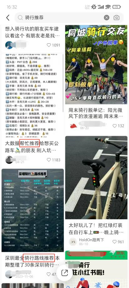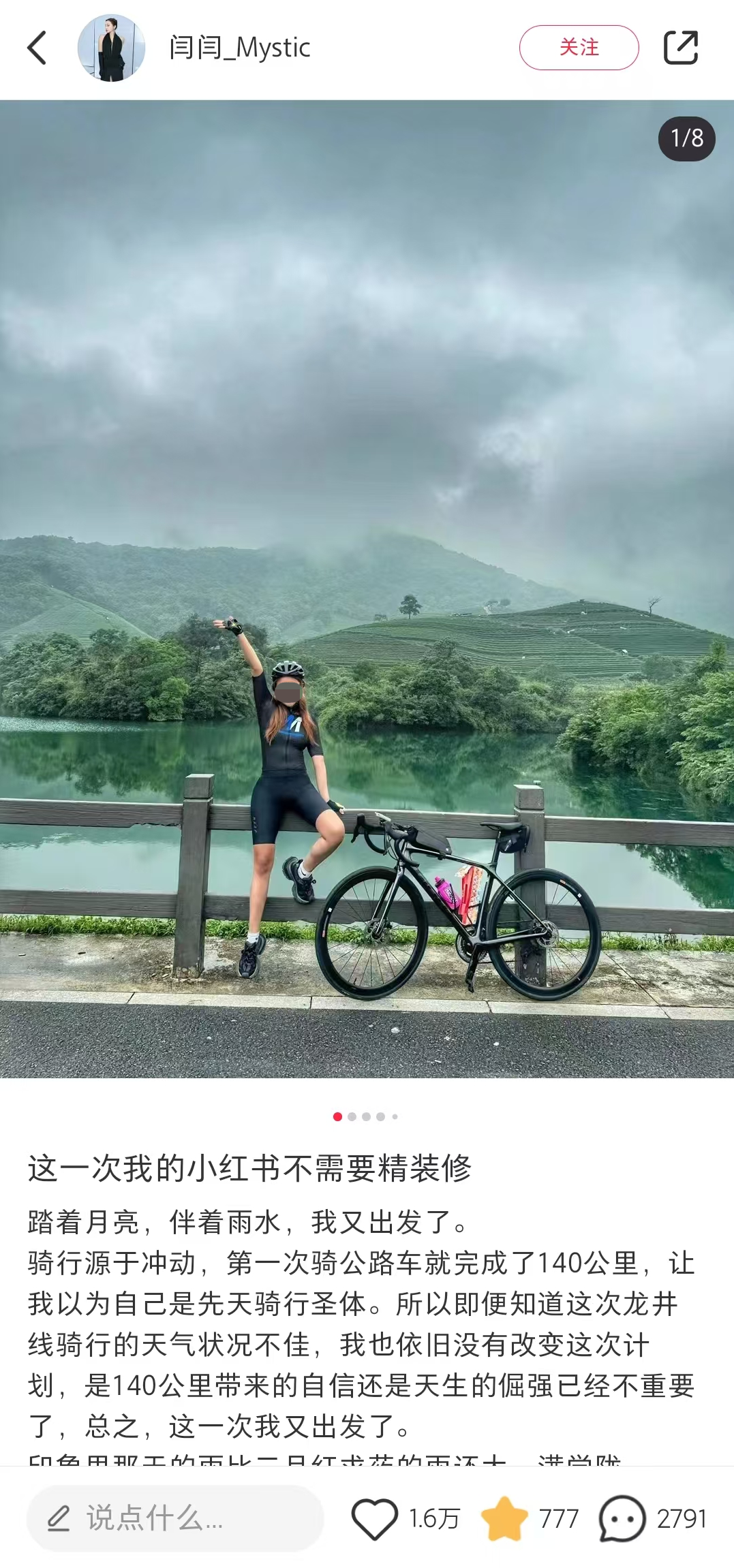 比如 @闫闫_Mystic 是一位时尚博主,粉丝数 17 万,日常的笔记的平均点赞数是 161。在 8 月初,她发布了一篇记录长途骑行过程的图文,很快便收获 1.6 万点赞和近 3000 的互动。在她的众多笔记中,涉及骑行的内容点赞量、互动率均明显高于平均表现。