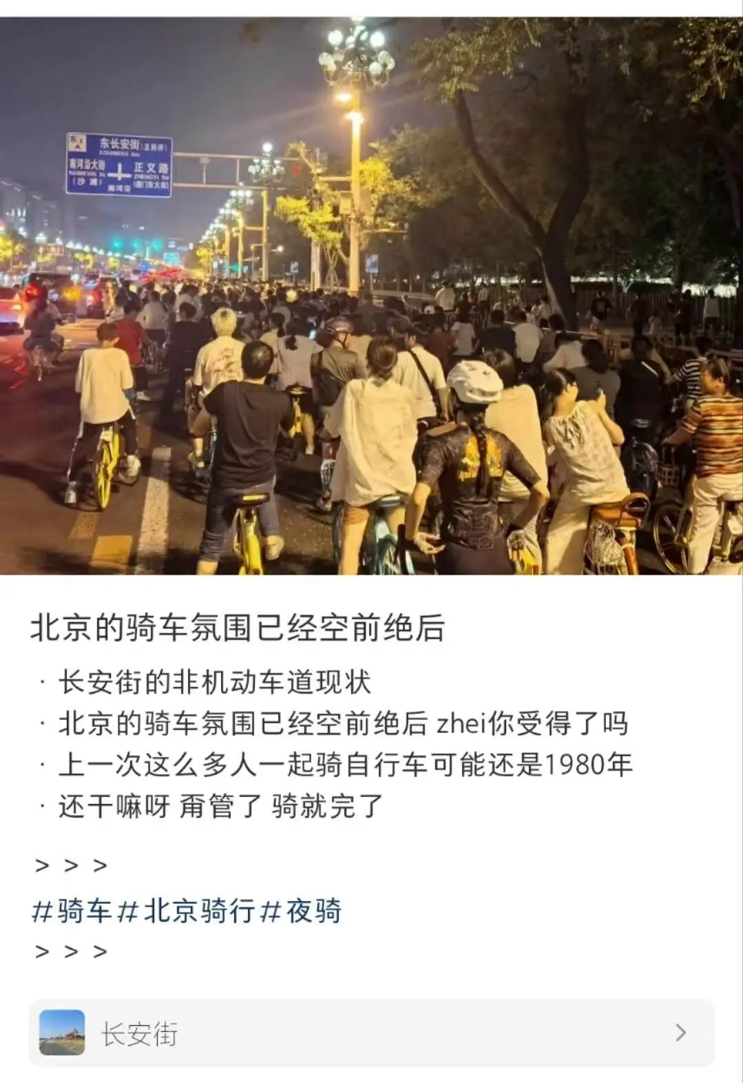 今年夏天,一到晚上,北京长安街就乌泱泱地挤满自行车。山地车、折叠车、共享单车交错前行,有人统计,一分钟能通过上百辆自行车。