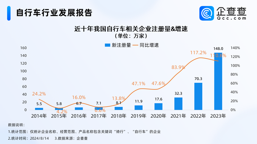 近十年,我国自行车相关企业注册量逐年增加,且增速基本逐年攀升,尤其是 2022 年累计注册 70.3 万家自行车相关企业,同比增加 117.2%,达近十年增速高峰。在此基础上,2023 年我国自行车相关企业注册量同比再增加 110.6% ,至 148.0 万家,接近 2014 年同期的 27 倍。