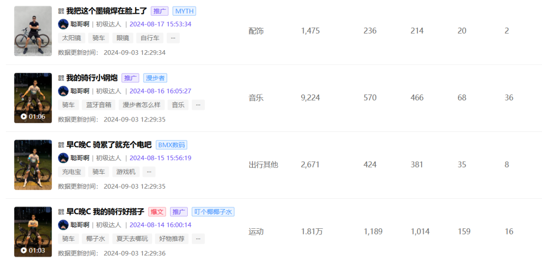 @聪哥啊 是一位骑行博主,几乎每一条内容都与骑行相关。他是去年 7 月才开始频繁更新,粉丝数量只有 1.5 万,但接了不少广告。千瓜数据显示,最近一个月他发布了 12 条视频,其中 6 条含有广告内容。以一条 1600 元的报价计算,月收入过万元,对于粉丝低于 2 万的博主而言已属于不错的水平。