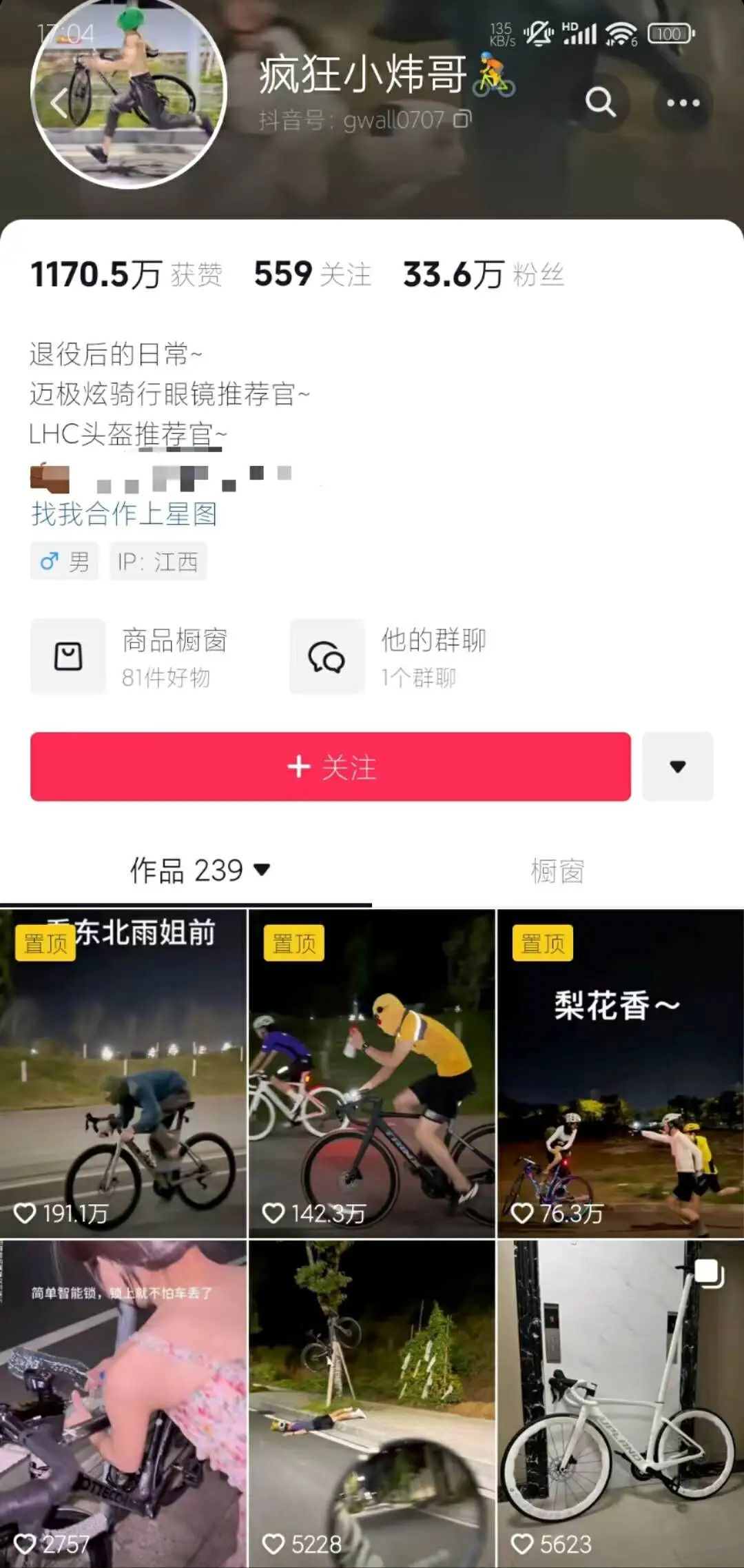 @蝉妈妈 则显示,@疯狂小炜哥 是抖音最近涨粉最多的骑行达人之一,主要围绕骑行分享段子,受众大部分是骑行爱好者。7 月初他的粉丝在 20 万左右,到了 8 月则激增至 33 万,一个多月涨粉 10 万+。