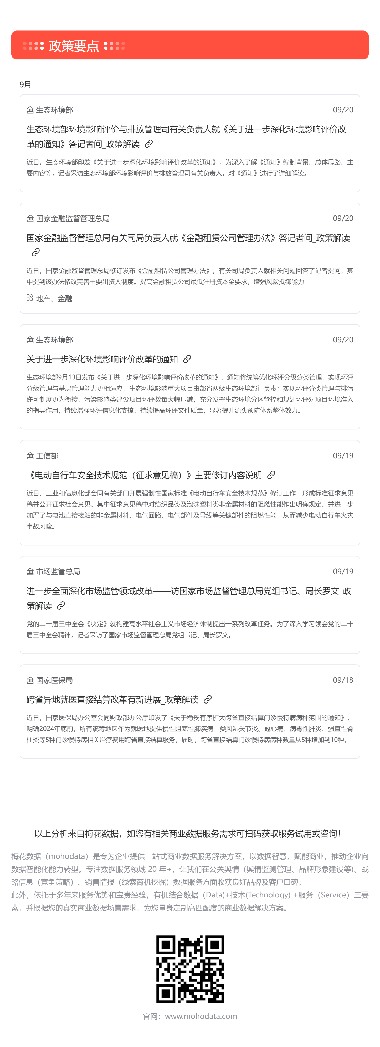 根据梅花数据舆情监测要政盘点统计,监测期间共收录重要政策信息共计25条,其中涉及金融、环保、医疗、电动自行车等多个领域,建议重点关注《金融租赁公司管理办法》、《关于进一步深化环境影响评价改革的通知》等政策。