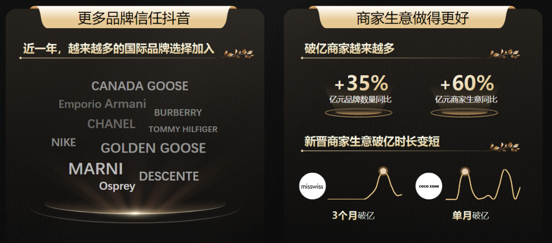 今年,抖音平台引领着全渠道服饰赛道的生意增长。据巨量引擎数据,从1月到7月,抖音服饰行业GMV同比增长38%,吸引了一众国际品牌加速入驻,破亿品牌数同比提升35%,新晋商家生意破亿时长也进一步变短。