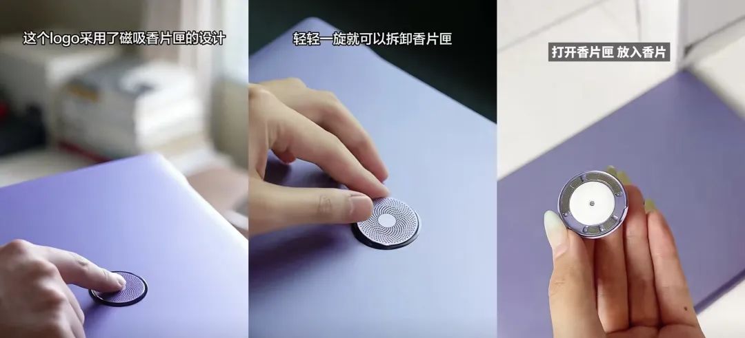 相关报道宣传称这是“全球第一款”自带香氛的笔记本(确实,全球能有这脑洞的,也没几个),机身A面创新设计了香片匣,轻轻一转,就可以把香片匣打开,放入香氛片。