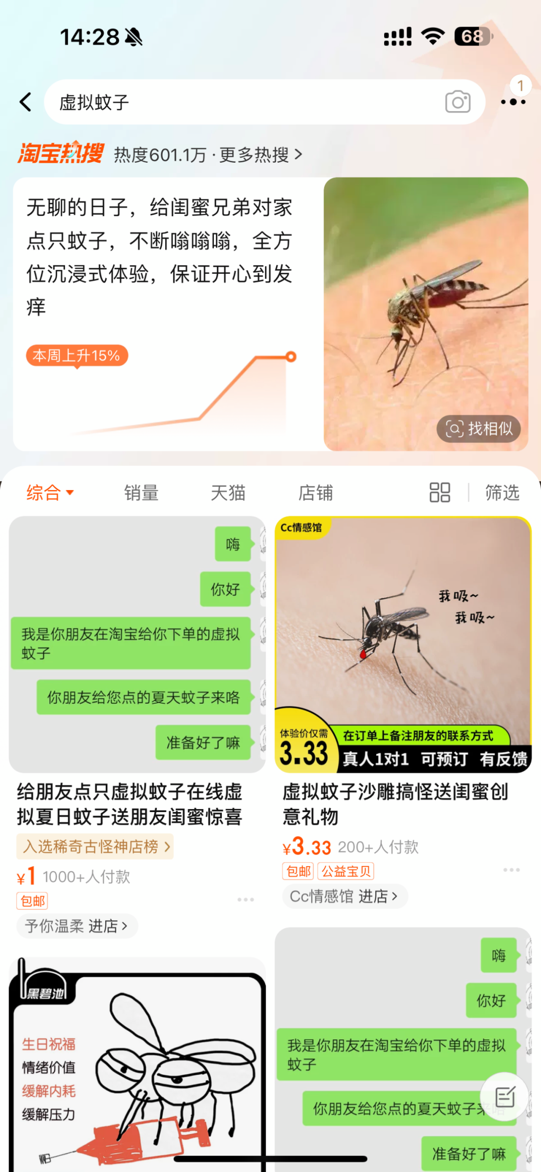 例如淘宝年销量100万+的明星单品“虚拟蚊子”,下单后客服添加好友,用文字模拟蚊子的叫声,为消费者提供一种全方位沉浸式体验,保证开心到发痒,用户晒单好评一片。