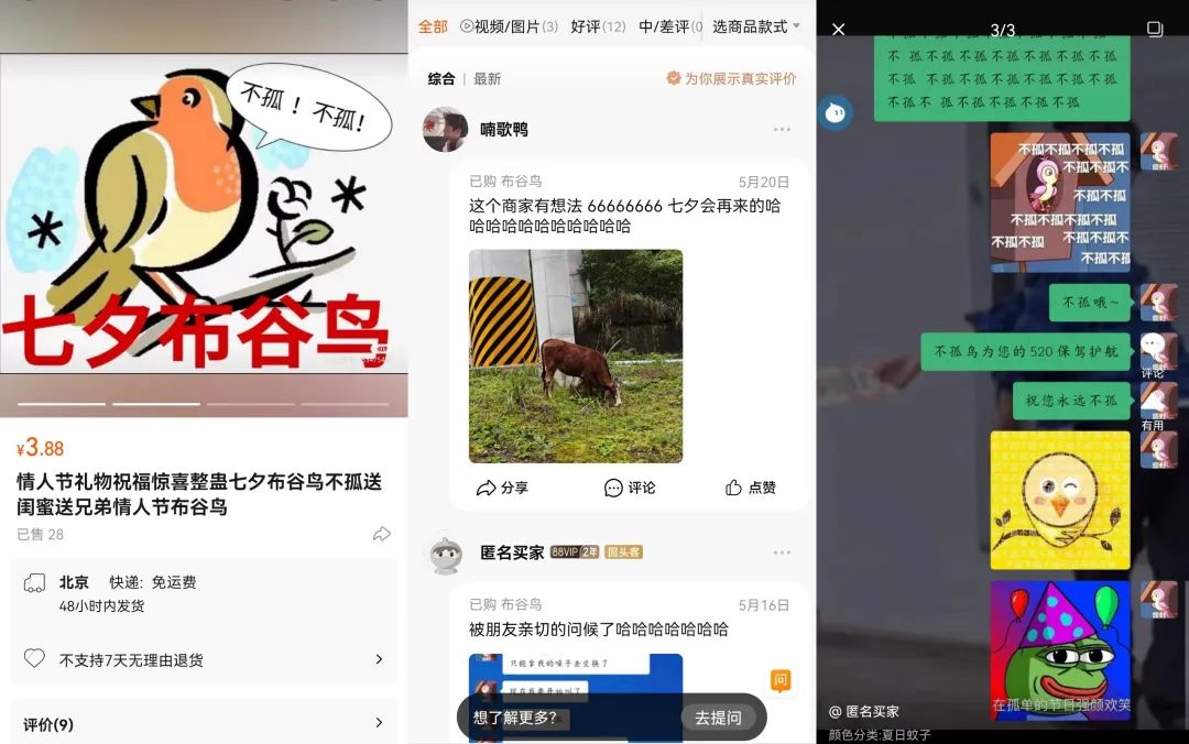 一到七夕和情人节“布谷鸟”服务就爆仓,“我是你朋友给你点的七夕布谷鸟,不孤不孤不孤”。还有,“爱因斯坦的脑子”“好运喷雾”“树洞倾听”等等,都成为受消费者喜爱的情绪“调剂品”。消费者购买这些商品,更是在购买一种情绪的释放、一种情感的寄托,这些商品以其独特的价值主张,反映了当代年轻人对于个性化、情绪化消费体验的渴望,而这对商家来说,也是新的机遇。